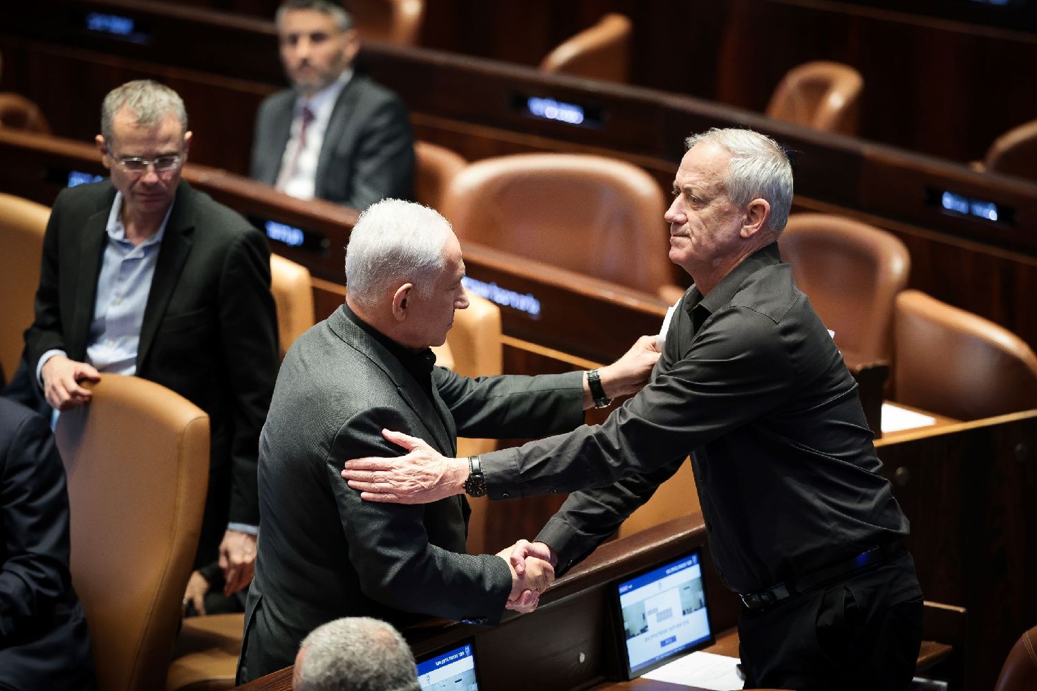 图为2023年10月12日,以色列总理内塔尼亚胡(左)与甘茨出席特别会议时握手。(图/新华社)