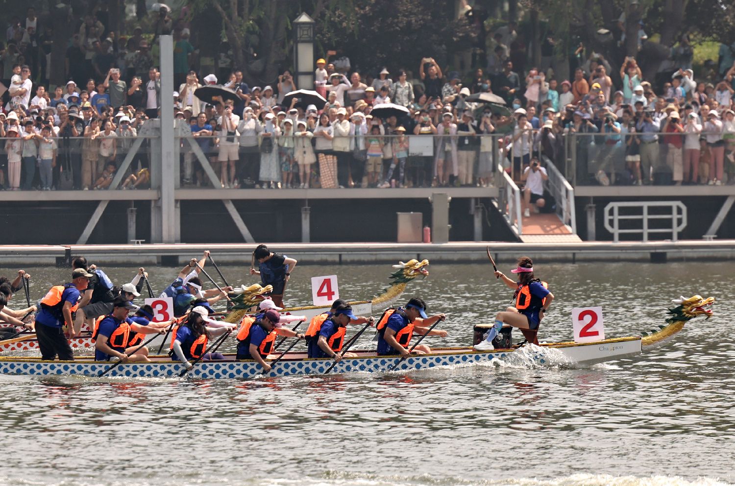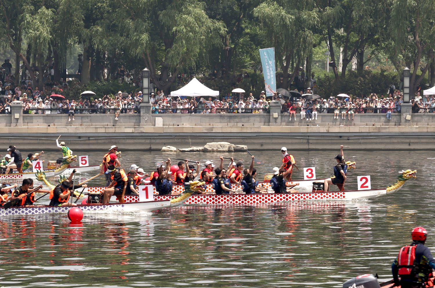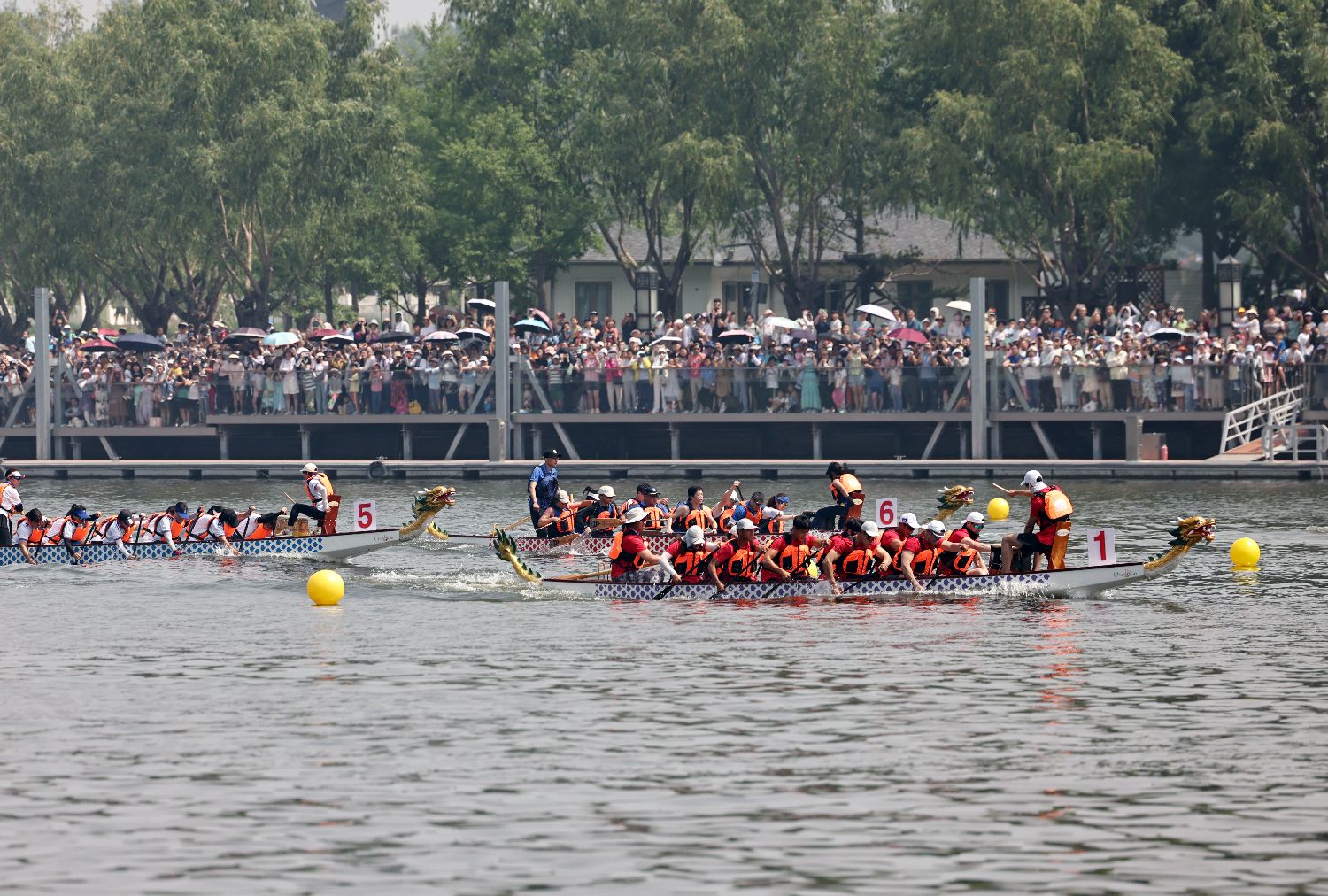 2024年6月10日,北京市端午龙舟赛开桨,选手们在鼓点和观赛民众的助威声中劈波斩浪。(卞亚文 摄)
