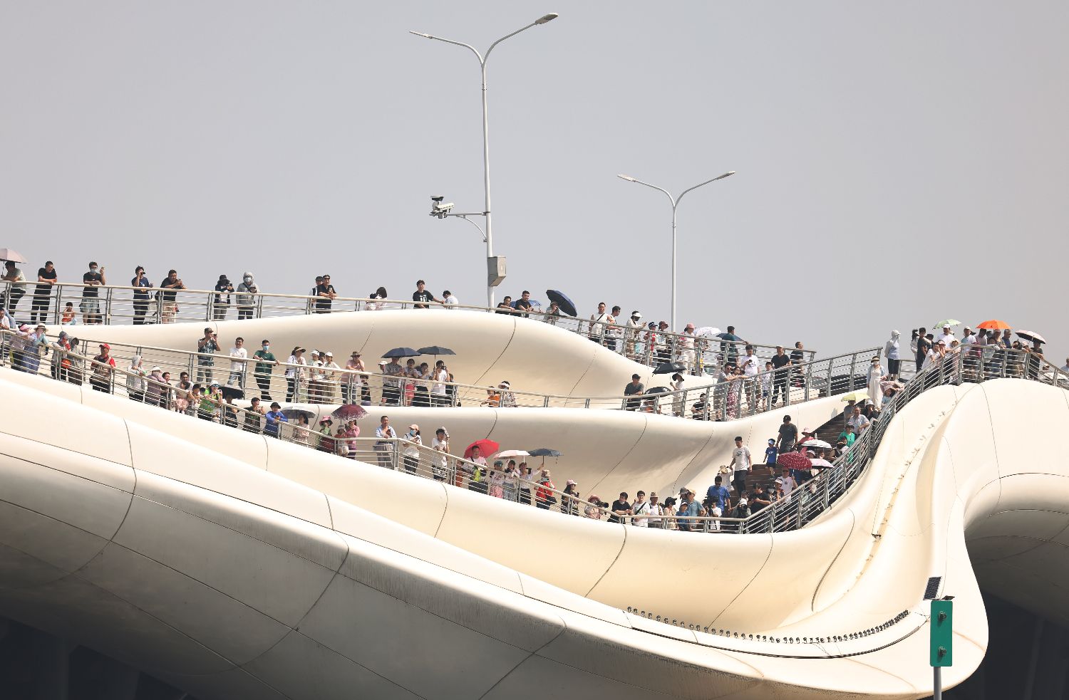 2024年6月10日,民众在北京通州区千荷泻露桥上观看北京市端午龙舟赛。(卞亚文 摄)