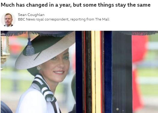 BBC也报道称,凯特出现在马车的窗口。当天晚些时候,她可能会在白金汉宫的阳台露面。