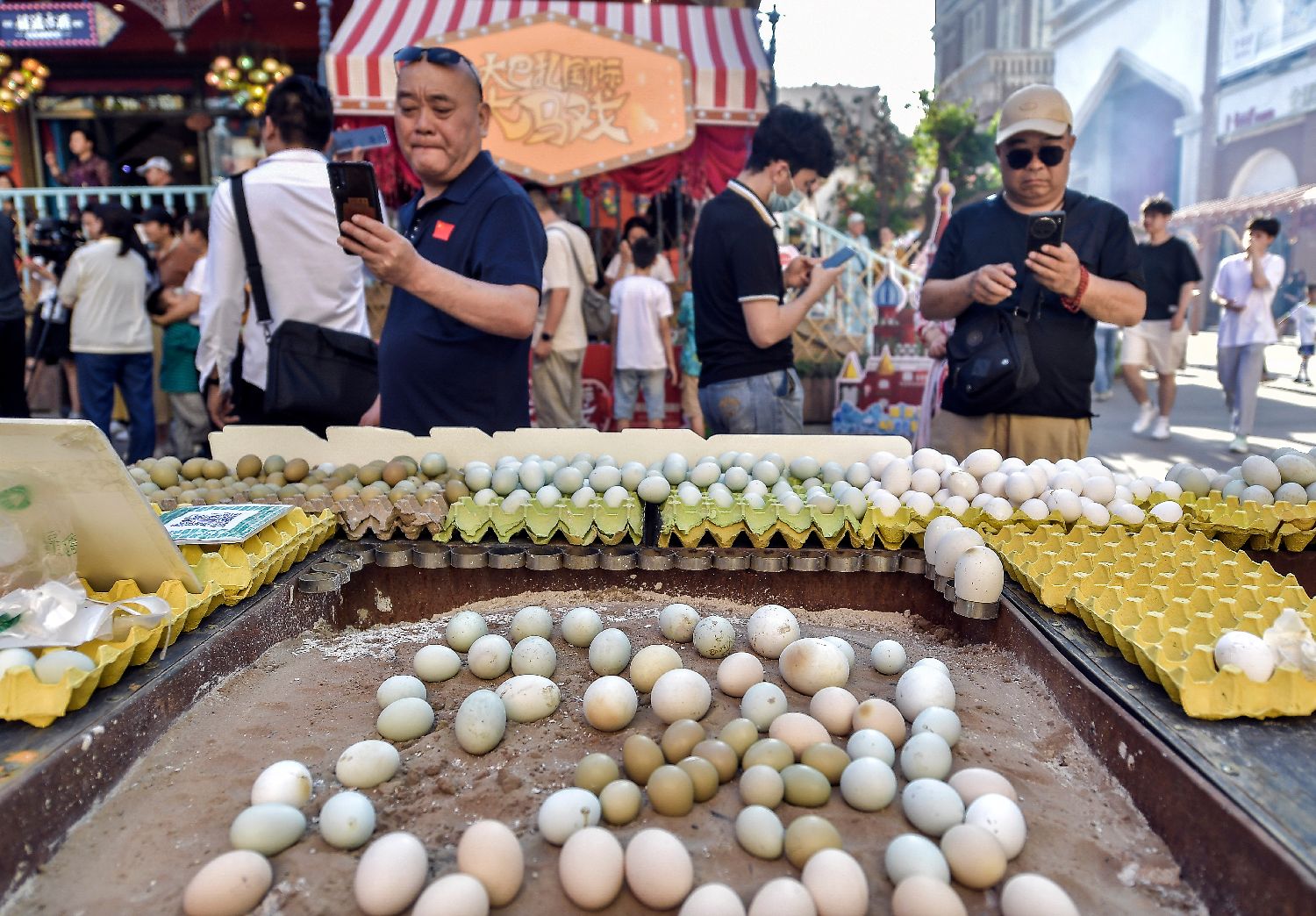 新疆乌鲁木齐大巴扎6月15日—19日举办第二届新疆烧烤节,烤羊肉串、烤蛋、沙漠烤鱼等新疆特色烧烤吸引大批食客前来品尝。图为来自新疆和田的烤蛋吸引食客。(中新社)