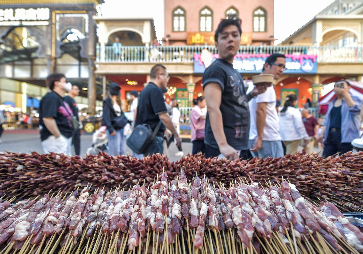 新疆乌鲁木齐大巴扎6月15日—19日举办第二届新疆烧烤节,烤羊肉串、烤蛋、沙漠烤鱼等新疆特色烧烤吸引大批食客前来品尝。