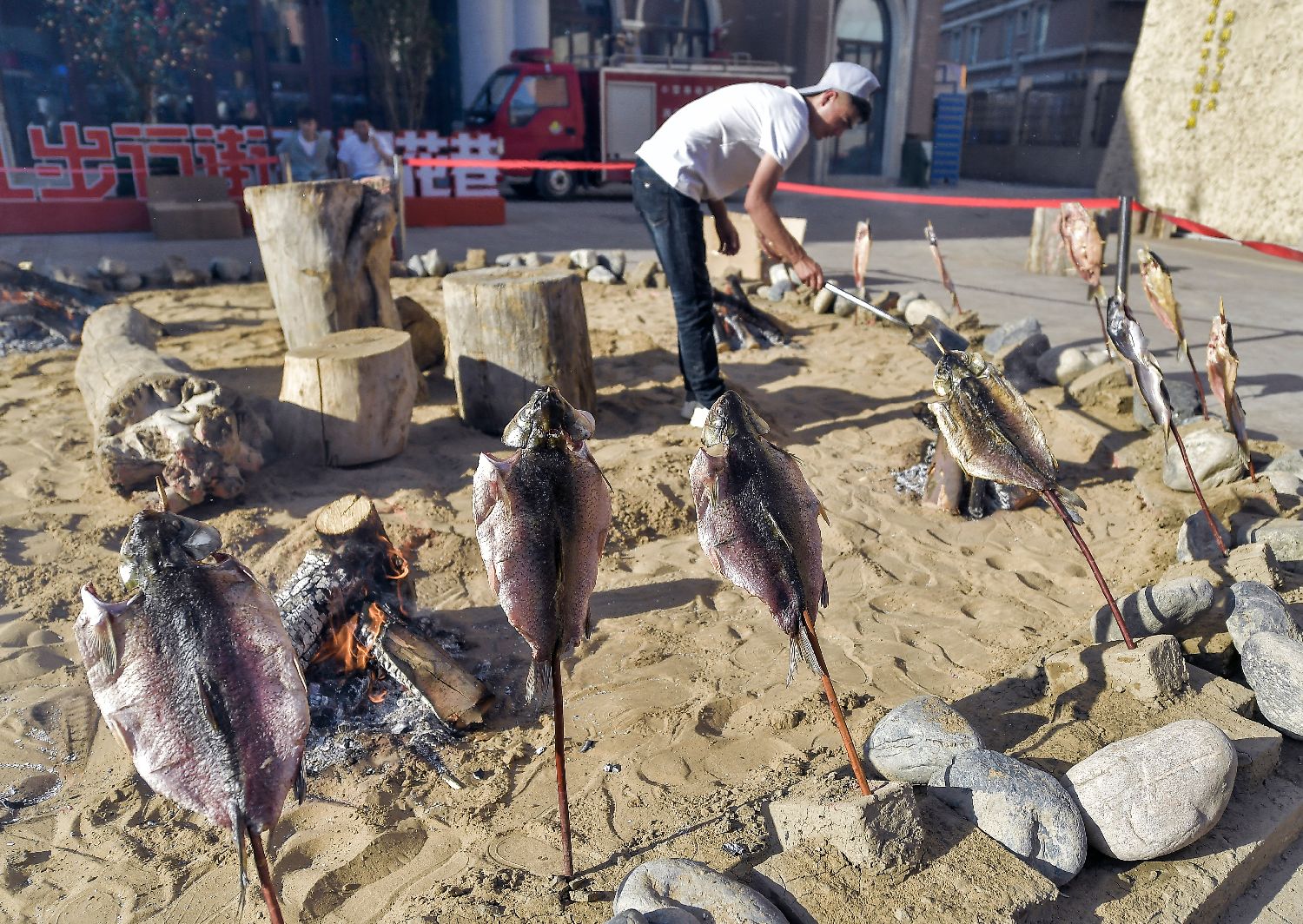 图为烧烤师傅在现场营造的沙漠环境中烤鱼。(中新社)