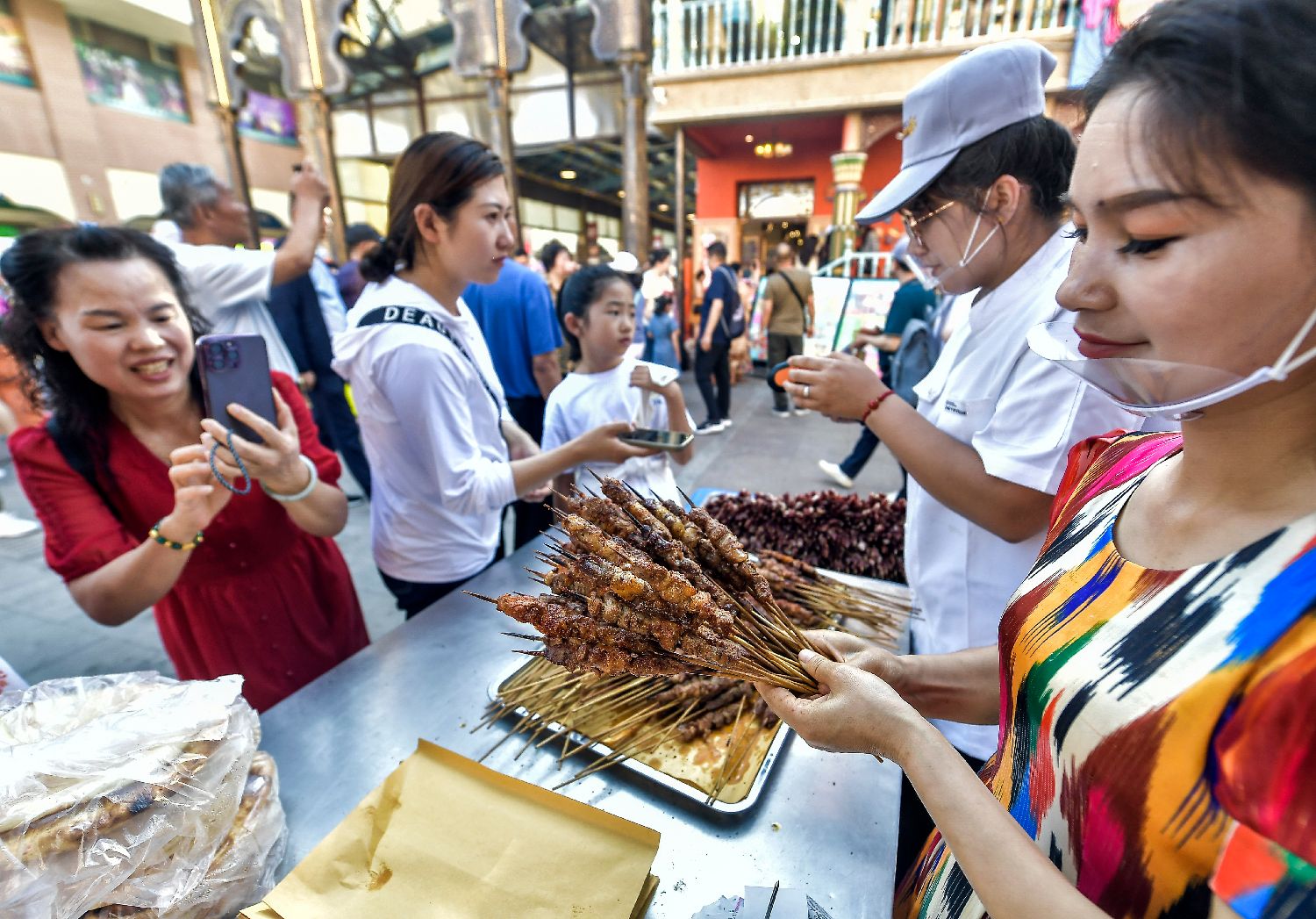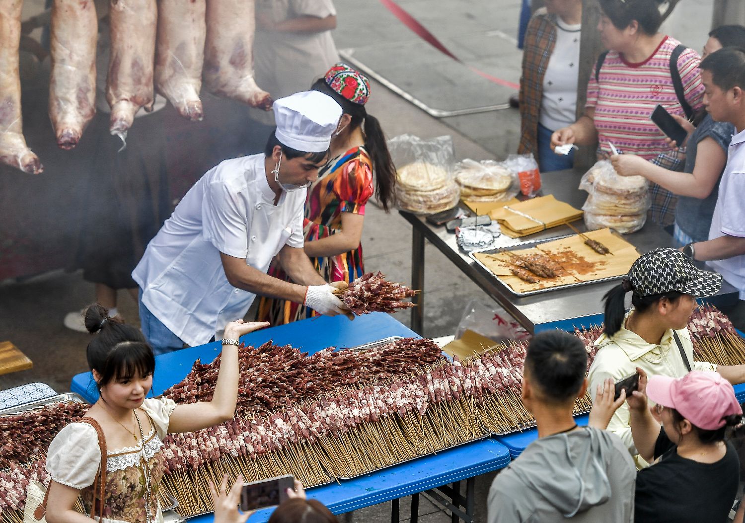 图为新疆特色烧烤吸引大批食客前来品尝。(中新社)