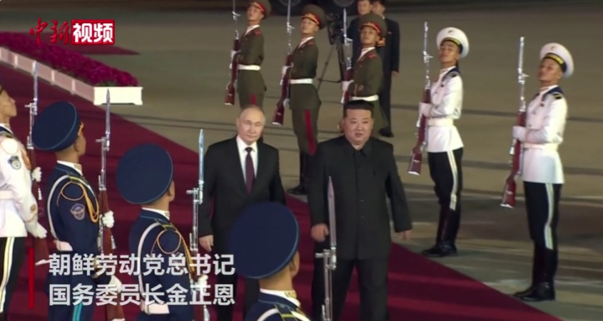 俄罗斯总统普京19日抵达朝鲜平壤,开始对朝鲜进行为期两天的国事访问。朝鲜最高领导人金正恩亲自到机场迎接普京。(图/中新视频截图)
