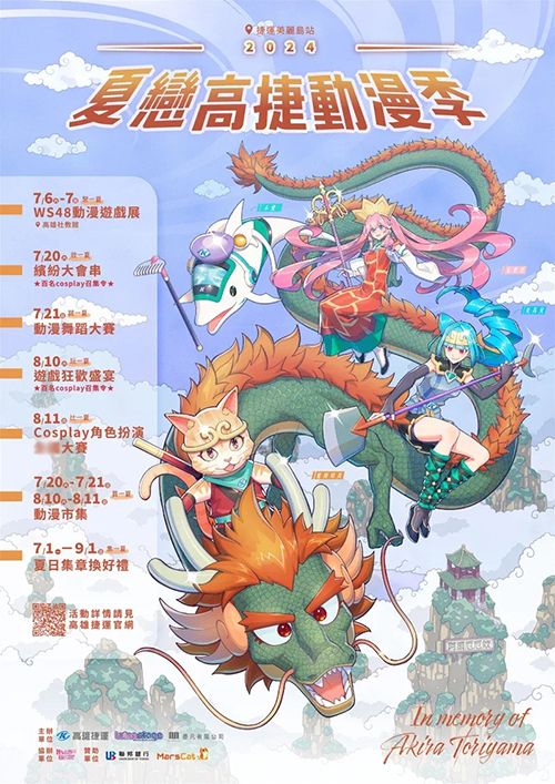 2024台湾夏恋高捷动漫祭即将开跑,今年的活动包括动漫游戏展、百名Coser召集令、动漫舞蹈大赛、动漫市集、Cosplay角色扮演大赛等,其中8月10日的百名Coser召集令,号召Coser打扮成“七龙珠”和“怪博士与机器娃娃”角色,向今年3月辞世的知名漫画家鸟山明致敬。