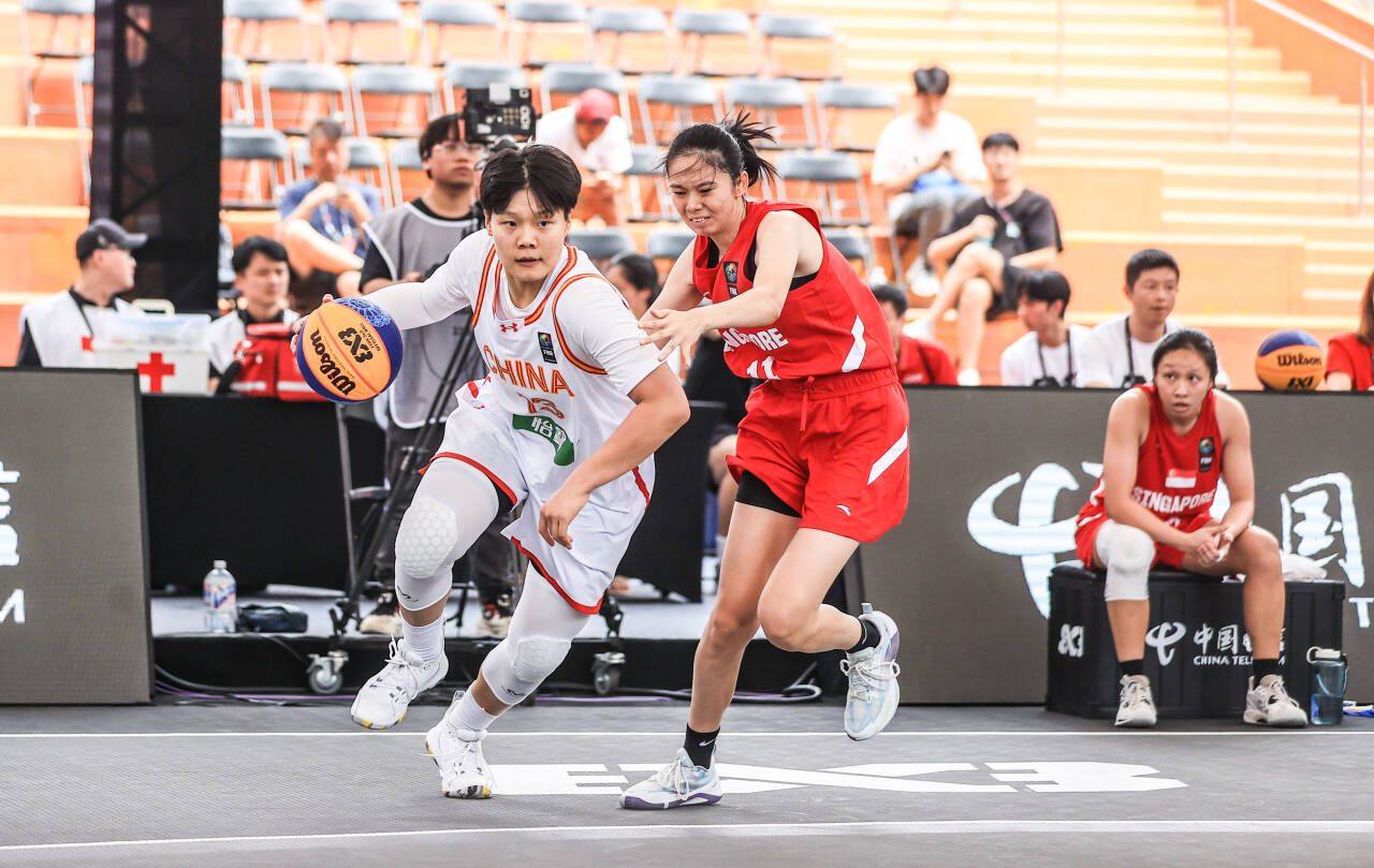 6月22日晚,2024国际篮联三人篮球女子系列赛决赛在成都举行,中国三人女篮队(白衣)以17:18不敌澳大利亚队,获得亚军。 (成都体育记者协会供图)