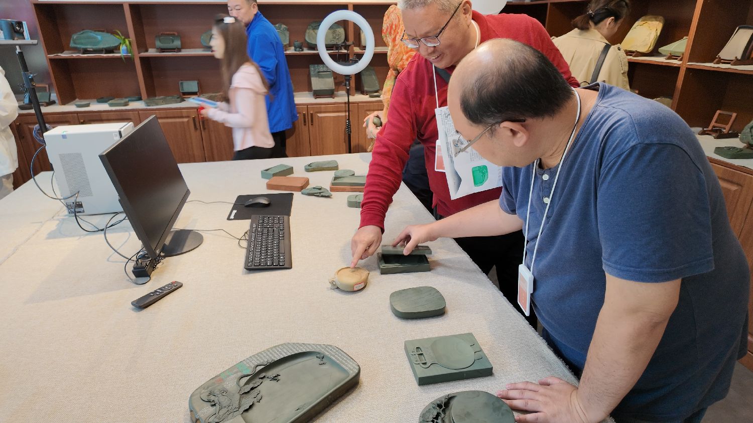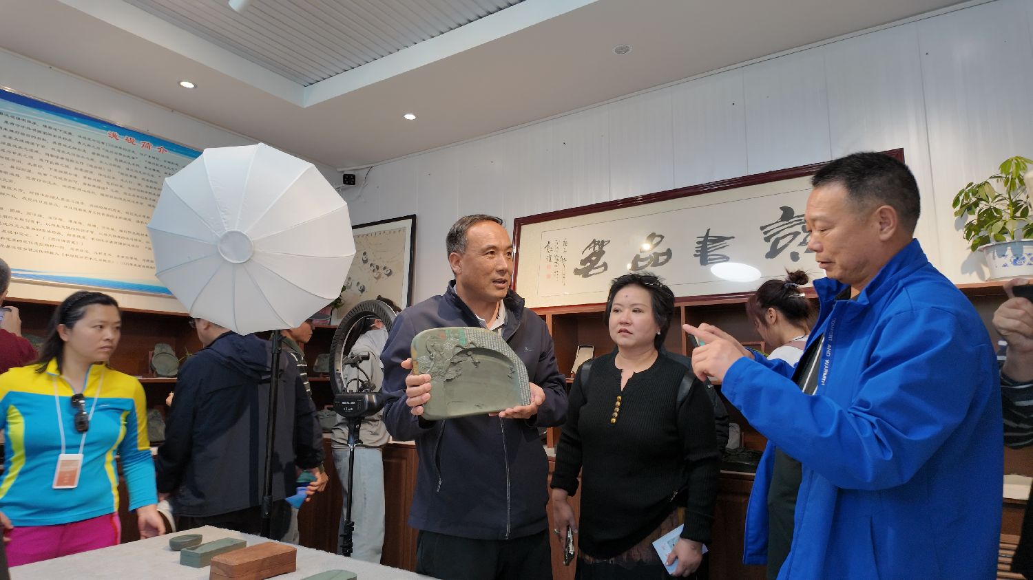 如今,洮砚以其精湛的传统技艺和完美的现代造型独树一帜,闻名遐迩,远销日本、东南亚等国家和地区。图为华媒代表欣赏洮砚作品。(山佳 摄)