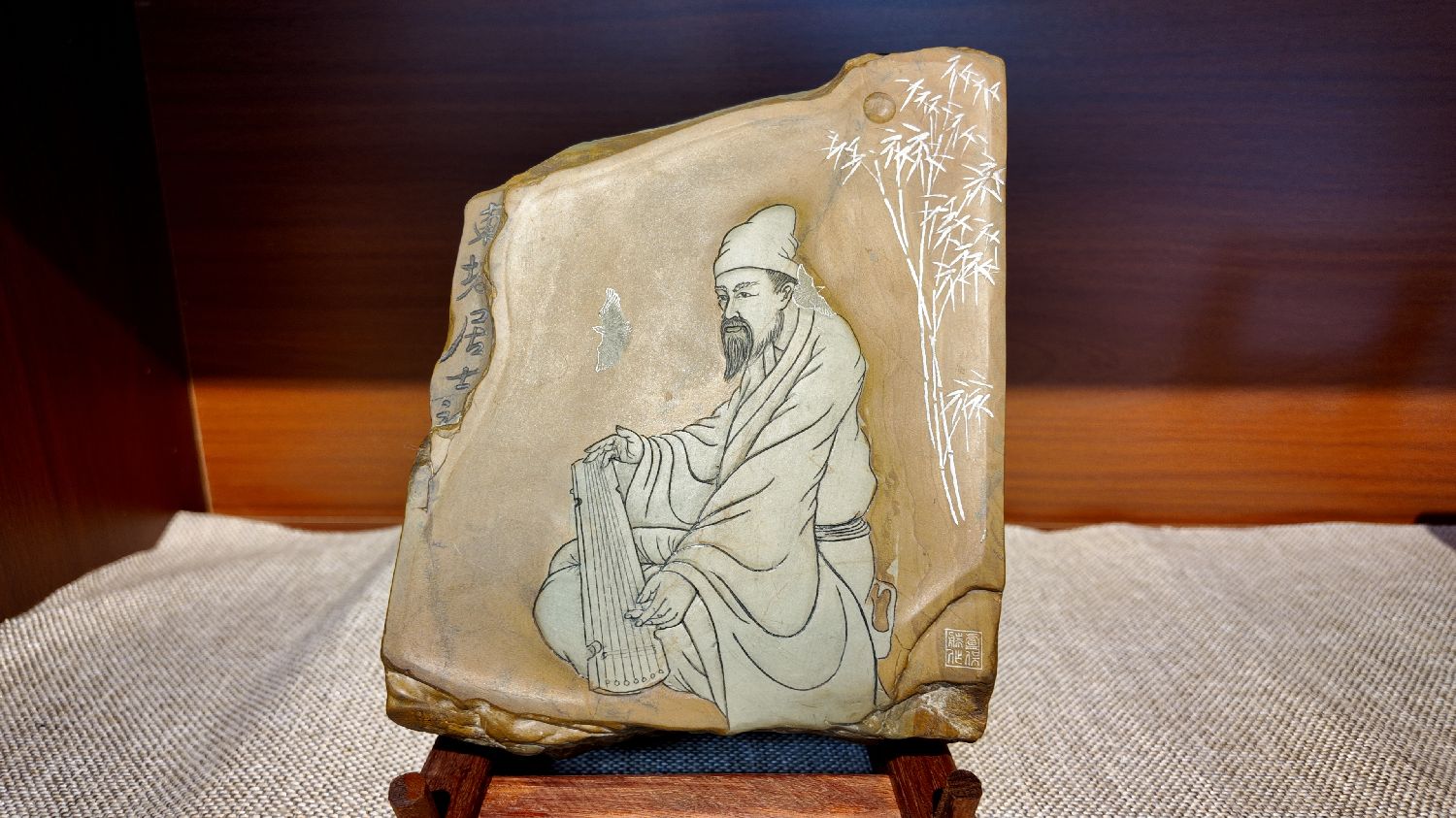 图为洮砚作品《东坡抚琴》。此砚选用甘肃省卓尼县洮砚镇水泉湾瓜皮黄石料,是一方罕见的双色砚料。(山佳 摄)