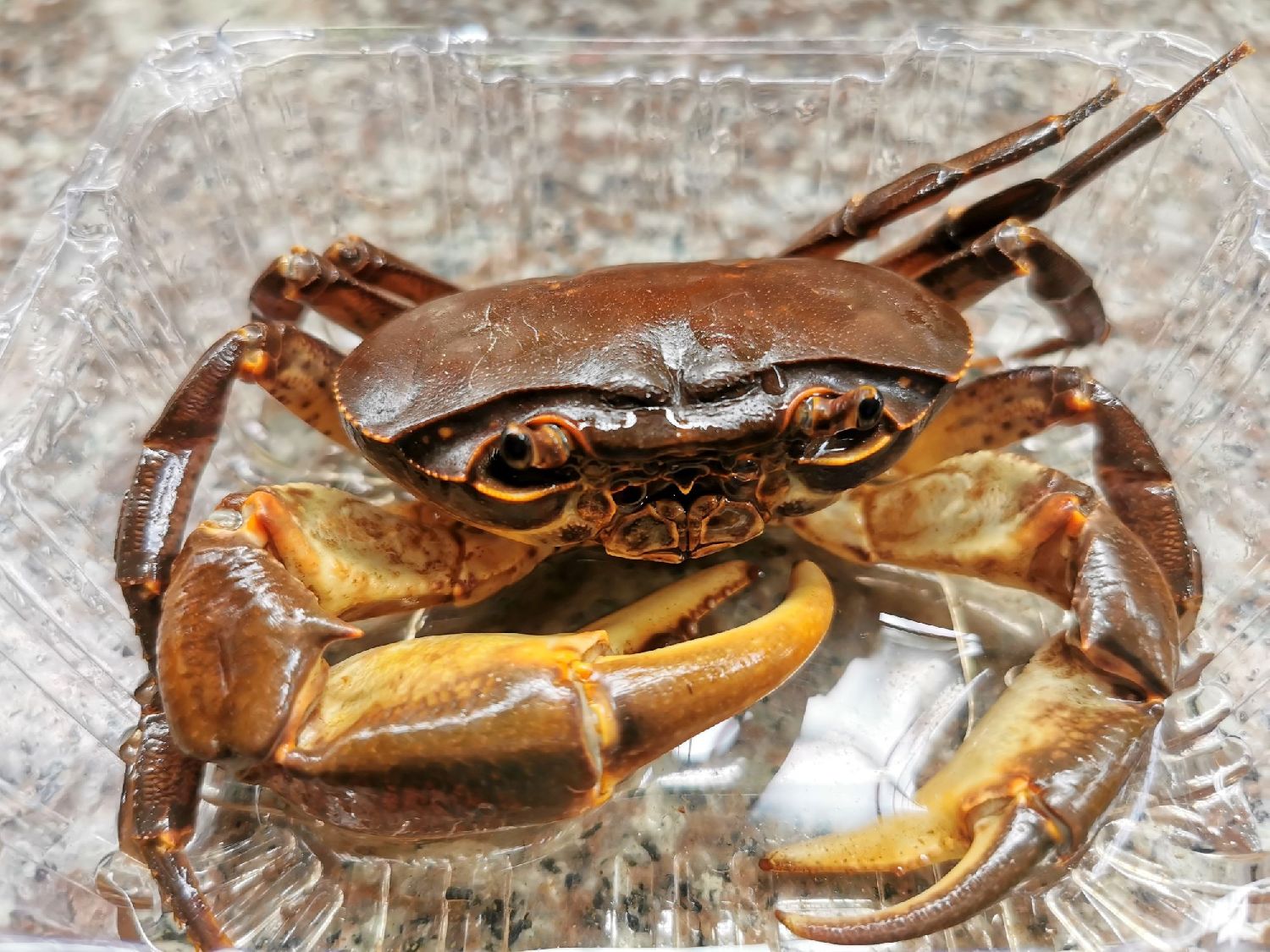 6月22日,广东省台山市,个头肥大的山螃蟹被装入胶盒中按个销售。(图/中新社)