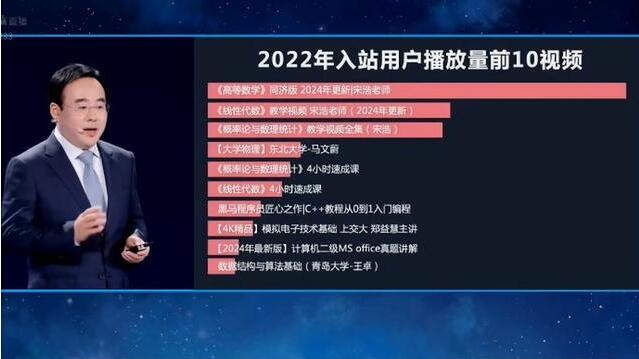 6月26日,中国弹幕视频网站B站十五周年庆上,董事长兼CEO陈睿公布的一组数据显示,B站2022年入站用户(00后)观看量最高的10支视频,均为大学课程类视频。其中数学视频共有5支,占比50%,其余视频分别为物理学和计算机技术类。而观看量前3名均为山东财经大学统计与数学学院副教授宋浩的数学课程。