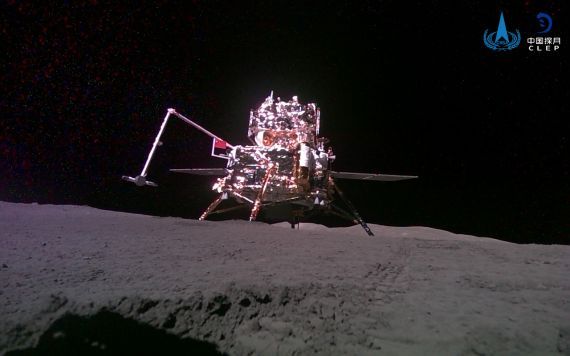 6月3日,嫦娥六号携带的“移动相机”自主移动后拍摄并回传的着陆器和上升器合影。(图/新华社)