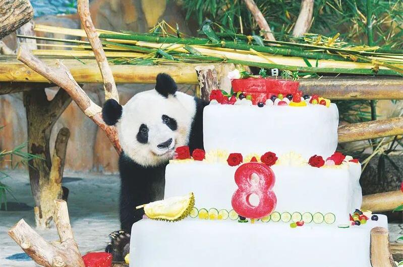 大熊猫“绩兰”准备享用生日蛋糕。(图/南宁市融媒体中心)