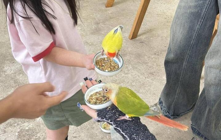 店内有不少年轻顾客,端着一小碗谷物喂食鹦鹉。鸟儿们沉醉在与人互动中,叽叽喳喳,闹个不停,乐于在顾客的手指尖跳跃、嬉戏。