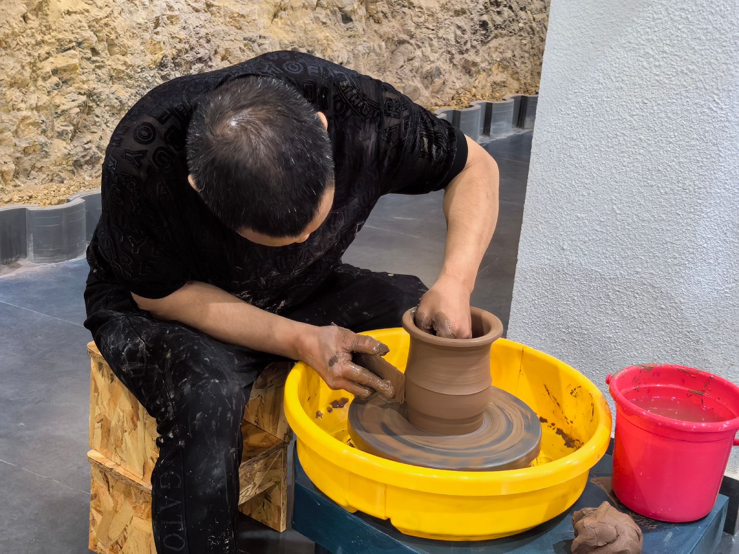博物馆内还设有非遗土陶制造体验区,供游客进行制陶体验。图为一名制陶工匠进行土陶制作流程中拉坯塑形环节的展示。(万鲤 摄)