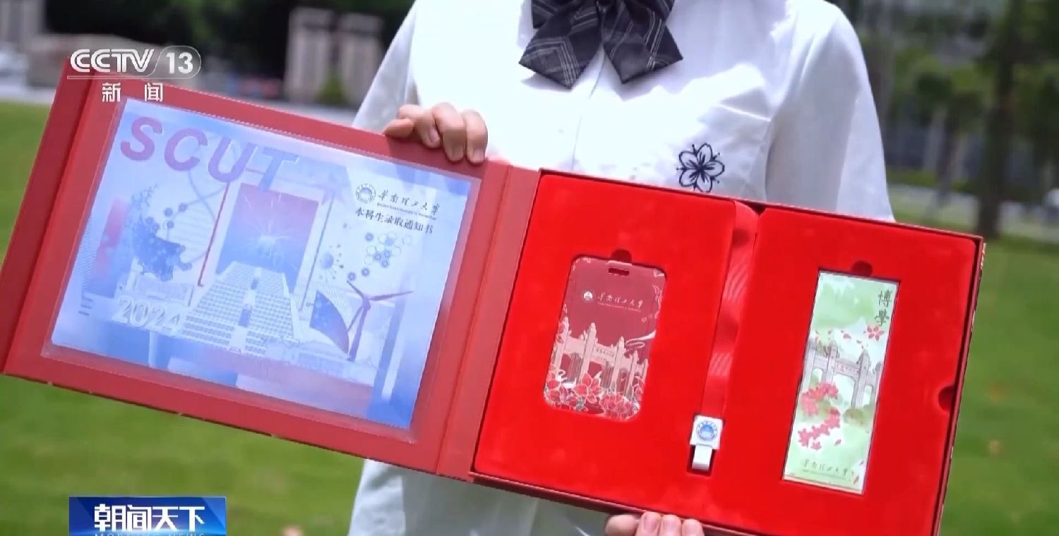 以“百步之上伸手摘星”为创作主题的华南理工大学2024年录取通知书。(中国央视新闻视频截图)