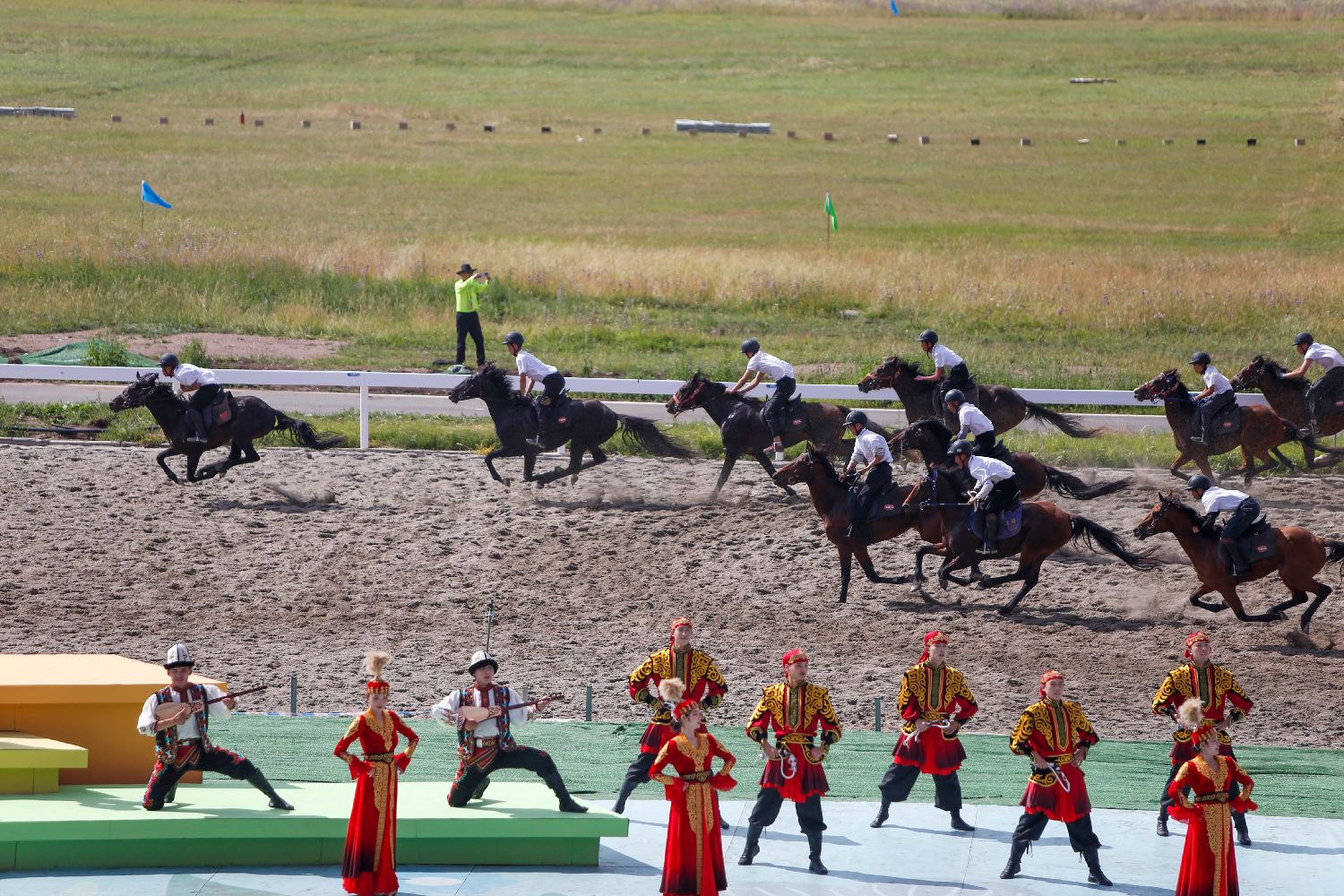 7月8日,运动员在民族赛马2000米比赛中出发。(新华社)