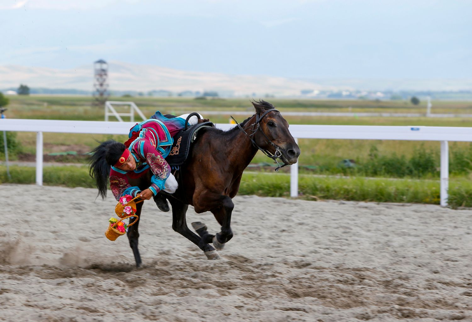 7月8日,内蒙古代表团运动员在表演项目技巧类马上技巧比赛中拾花篮。(新华社)