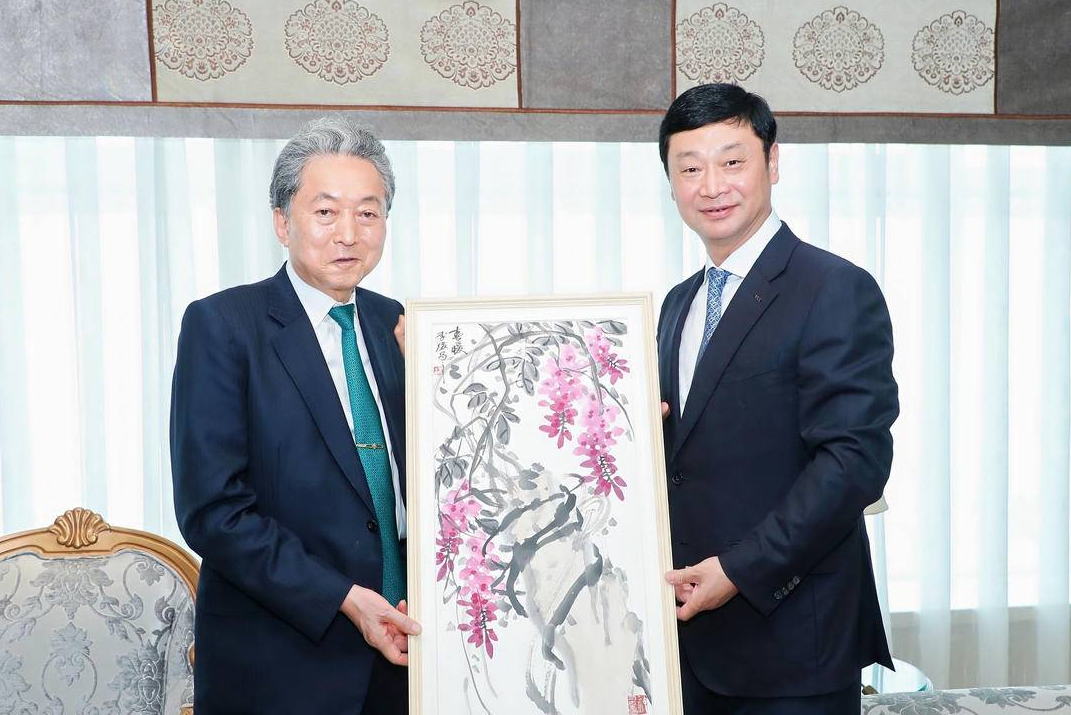 近日,日本前首相、东亚共同体研究所理事长鸠山由纪夫在出席北京“第十二届世界和平论坛”之前,在辽宁大厦会见了江苏泰州籍中国书画家李俊,并收藏其中国画佳作《春暖》。