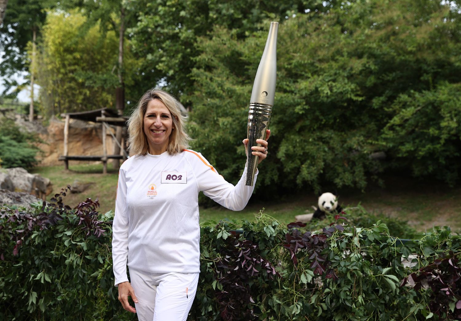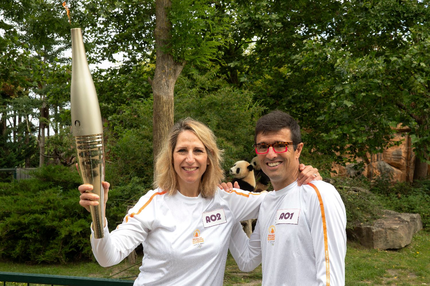 7月8日,博瓦勒野生动物园园长鲁道夫·德洛尔(右)和法国航海家莫德·丰特努瓦传递奥运圣火,身后是大熊猫双胞胎“欢黎黎”和“圆嘟嘟”。当日,巴黎2024奥运圣火来到位于法国中部城市圣艾尼昂的博瓦勒野生动物园进行传递,旅法大熊猫“圆仔”“欢黎黎”“圆嘟嘟”见证了这一历史时刻。(新华社)