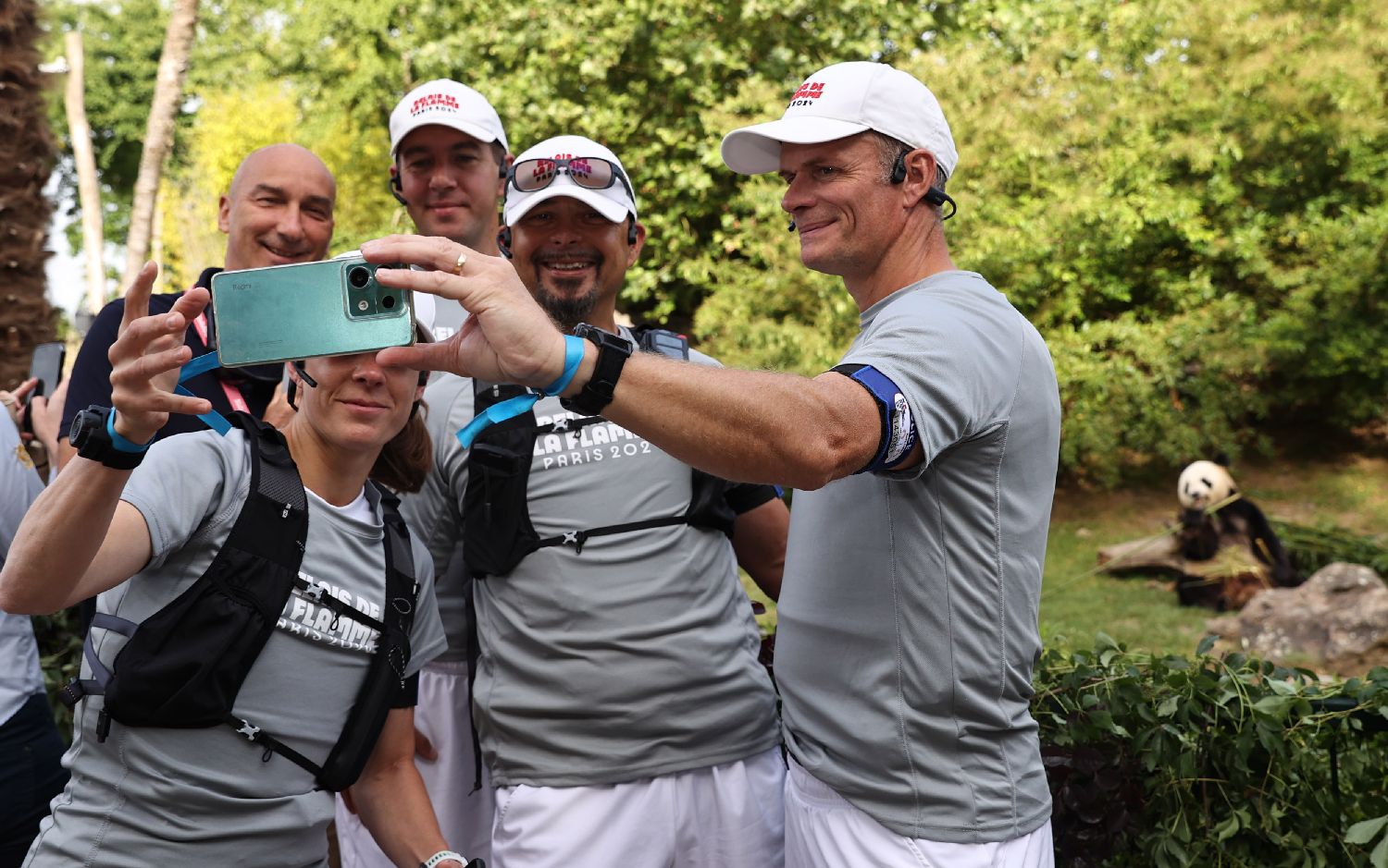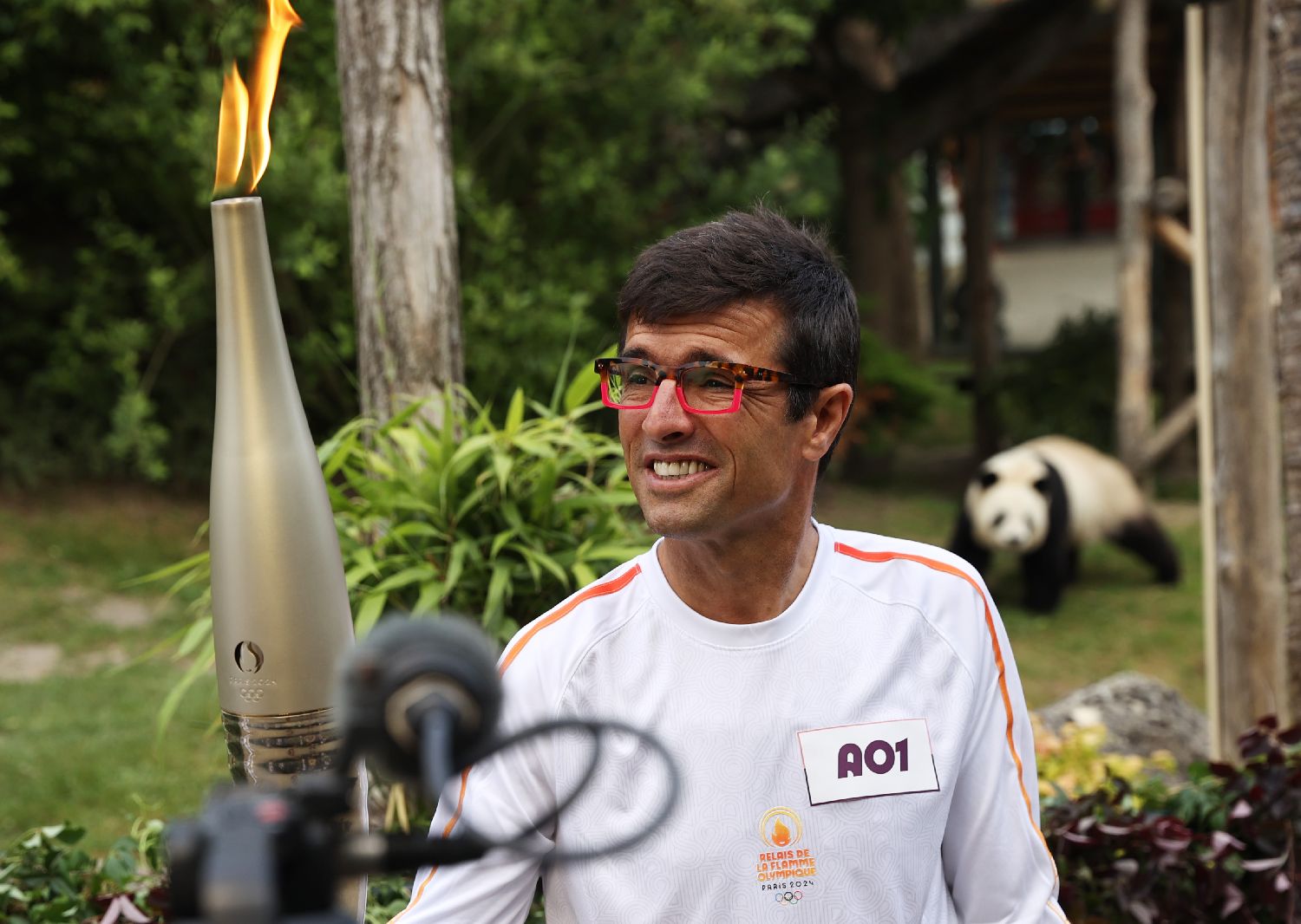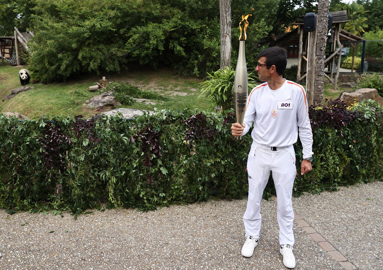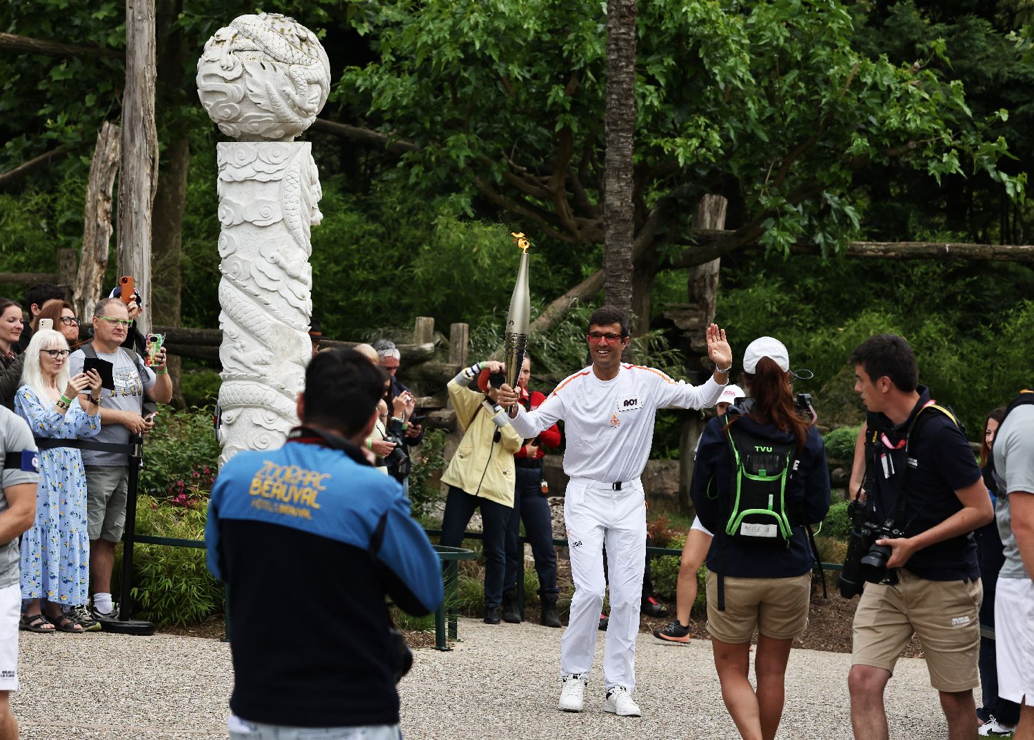 巴黎2024奥运圣火7月8日来到位于法国中部城市圣艾尼昂的博瓦勒野生动物园进行传递,旅法大熊猫“圆仔”“欢黎黎”“圆嘟嘟”见证了这一历史时刻。