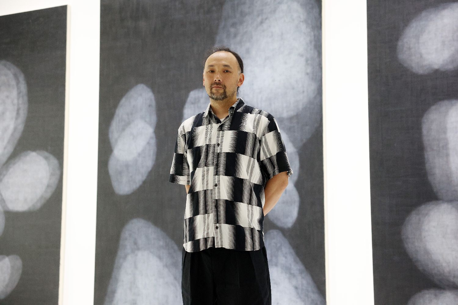 7月9日,日本艺术家石井友人在自己的展品前留影。据介绍,石井友人1981年出生于东京。2006年毕业于武藏野美术大学造型研究科美术油画专业并取得硕士学位。(黎明 摄)