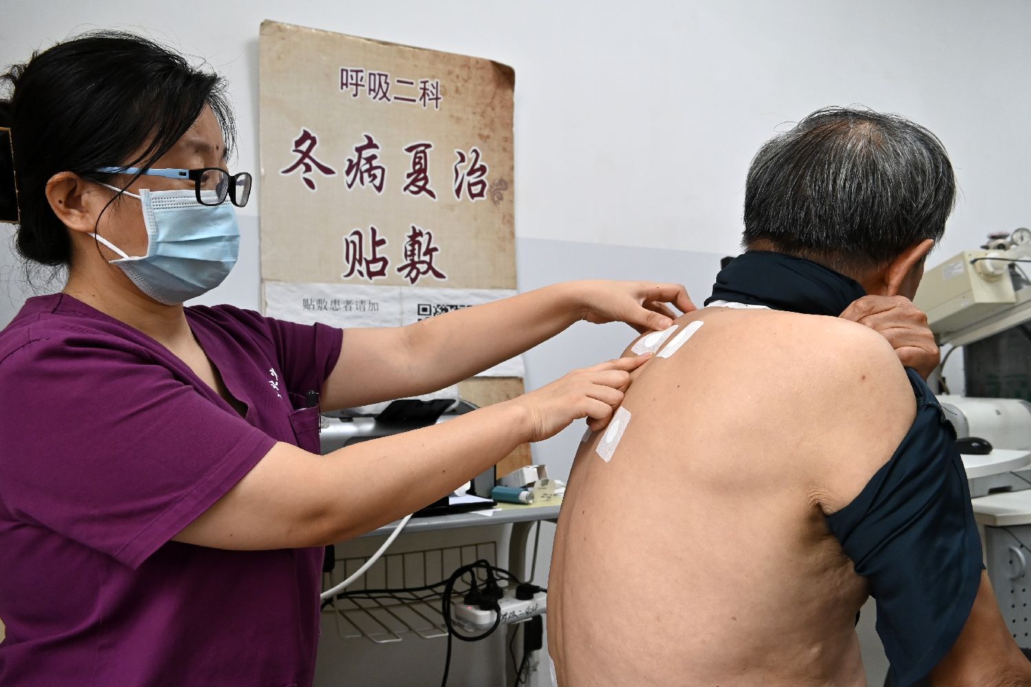 图为位于石家庄市的河北省中医院呼吸科,医护人员为市民贴敷治疗。7月15日是2024年夏季入伏第一天,不少市民利用中国传统中医贴敷药灸疗法进行“冬病夏治”。(中新社)