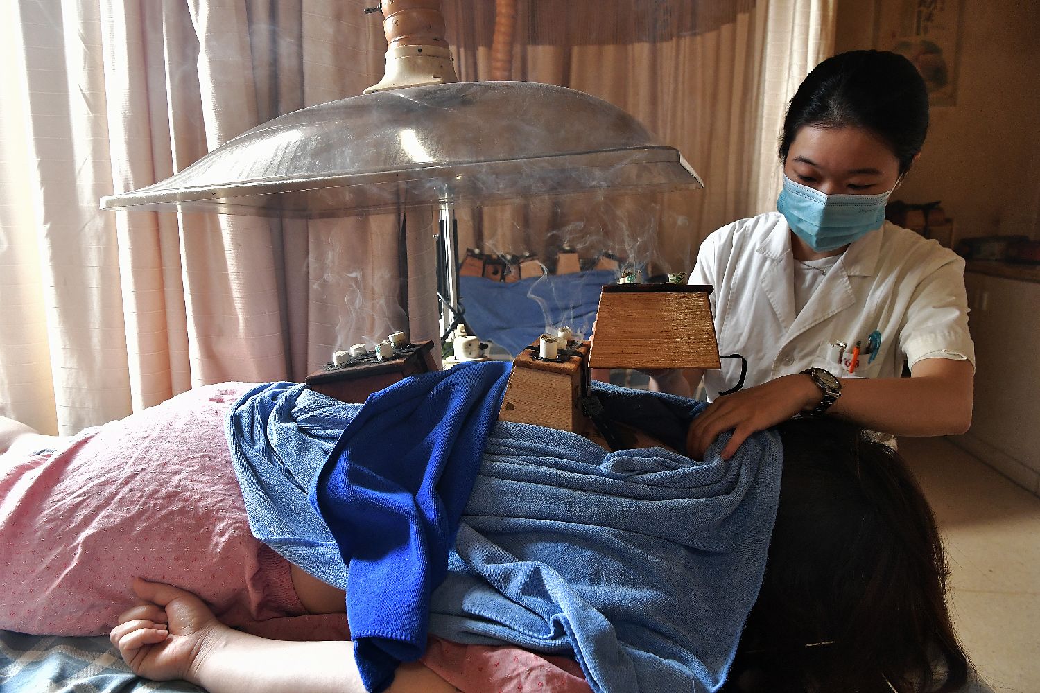 7月15日,市民在福建中医药大学国医堂进行传统督脉灸。在三伏天进行“灸疗”是中国传统医学中最具特色的伏天保健疗法,在福州多家医院和中医诊疗机构,三伏灸受到民众的青睐。(中新社)
