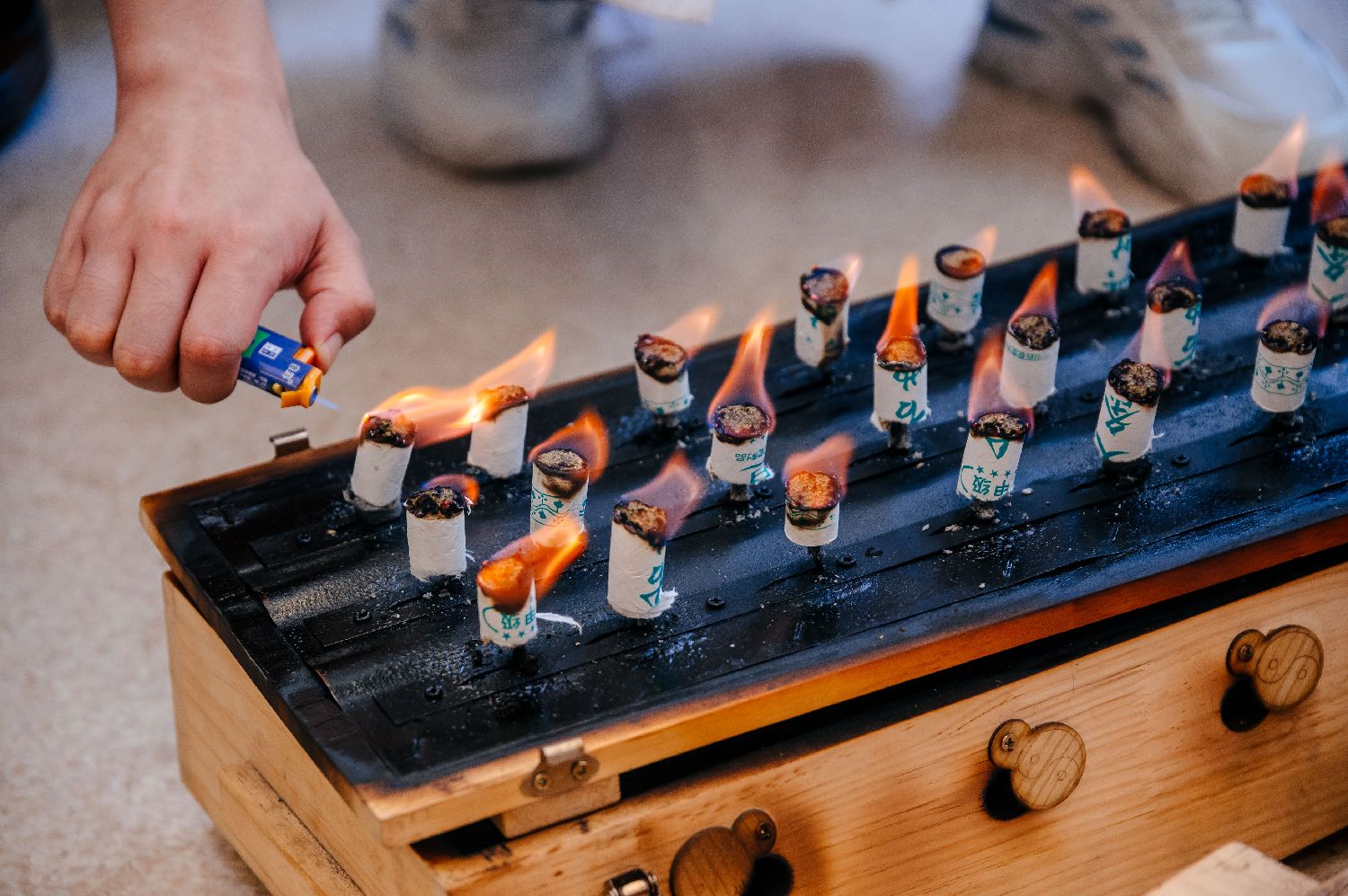 7月15日,福建中医药大学国医堂的医生在点燃艾条。(中新社)