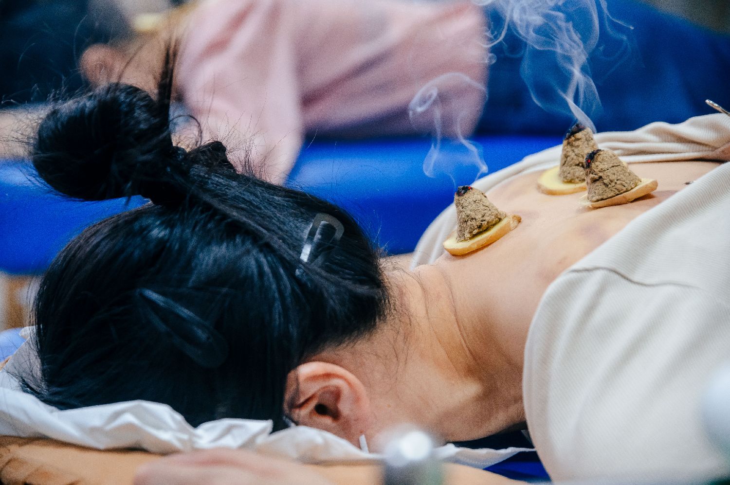 7月15日,福建中医药大学国医堂的医生在进行“隔姜灸”治疗。(中新社)
