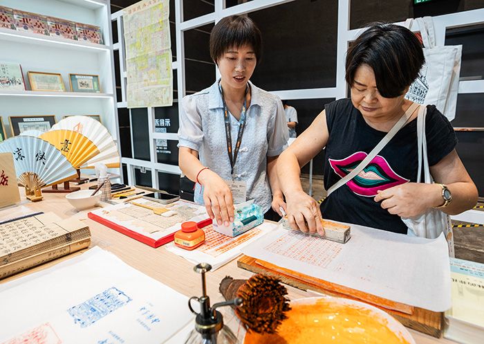 一名观众在北京主题展区体验拓印技艺。(图/中新社)