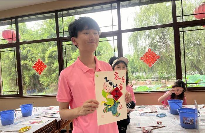 7月23日,华裔青少年展示在四川德阳制作的绵竹年画。(图/中新网)