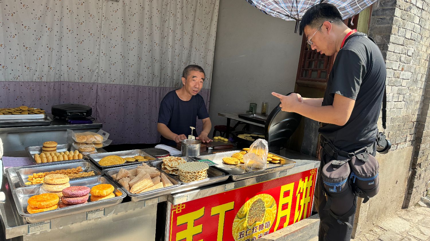 平遥古城一角。图为海外华文媒体代表正在购买手工月饼。(凉子摄)