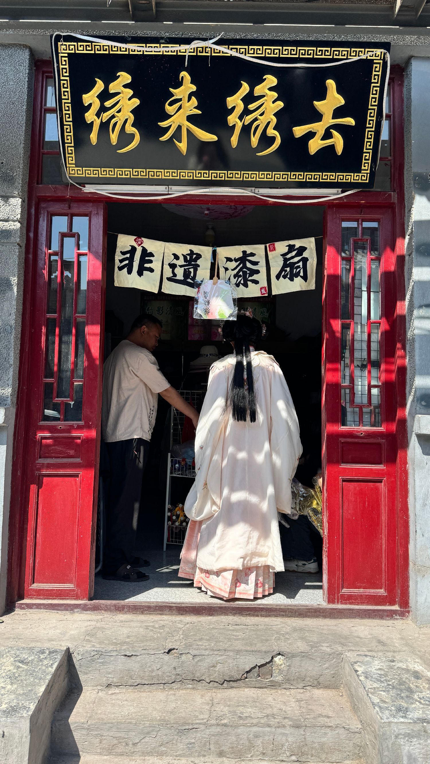 一名穿着古装的女子停在一家非遗漆扇店前。(凉子摄)