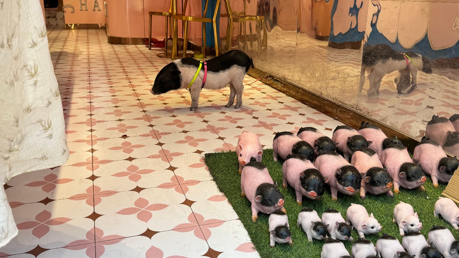 平遥古城一家店内,一只姿态优雅的小猪。(凉子摄)