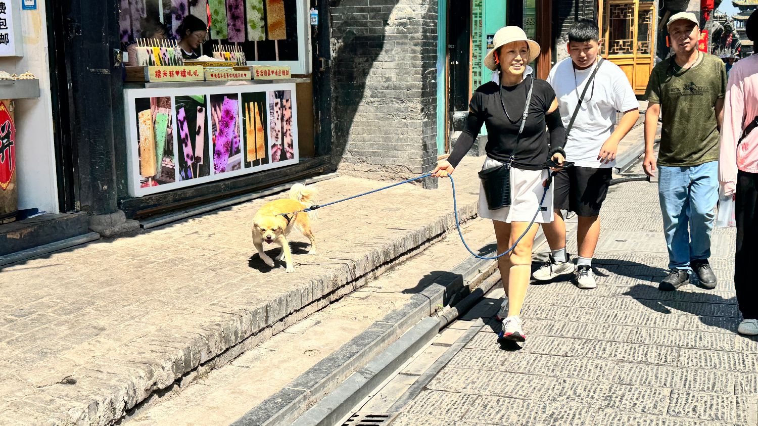 平遥古城内,一名女子牵着狗狗逛街,狗狗总与主人往反方向走。(凉子摄)