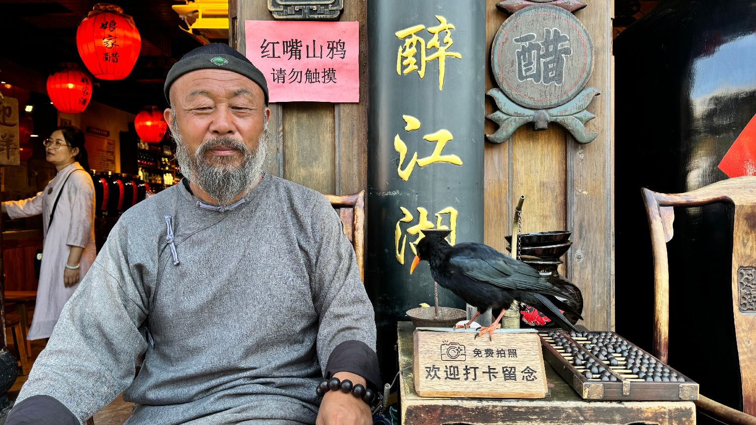 图为古城内拍照打卡处,大爷带着他的“朋友”红嘴山鸦。(凉子摄)