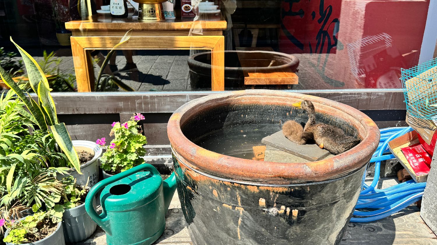 一家店在门口的水缸中养了鸭子。(凉子摄)