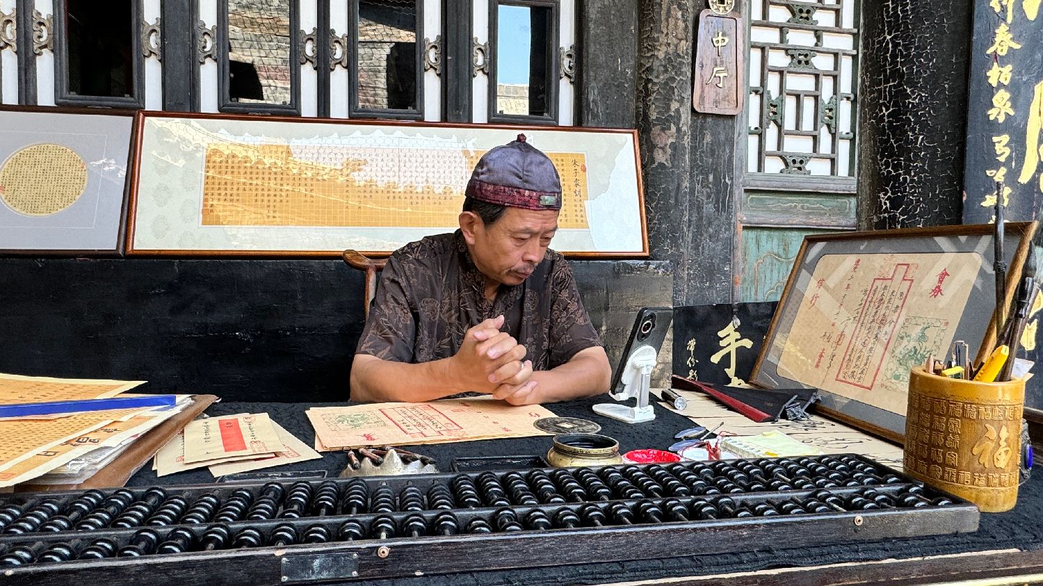 日升昌票号是中国第一家专营存款、放款、汇兑业务的私人金融机构,开中国银行业之先河。图为在日升昌票号中穿着古装的工作人员。(凉子摄)