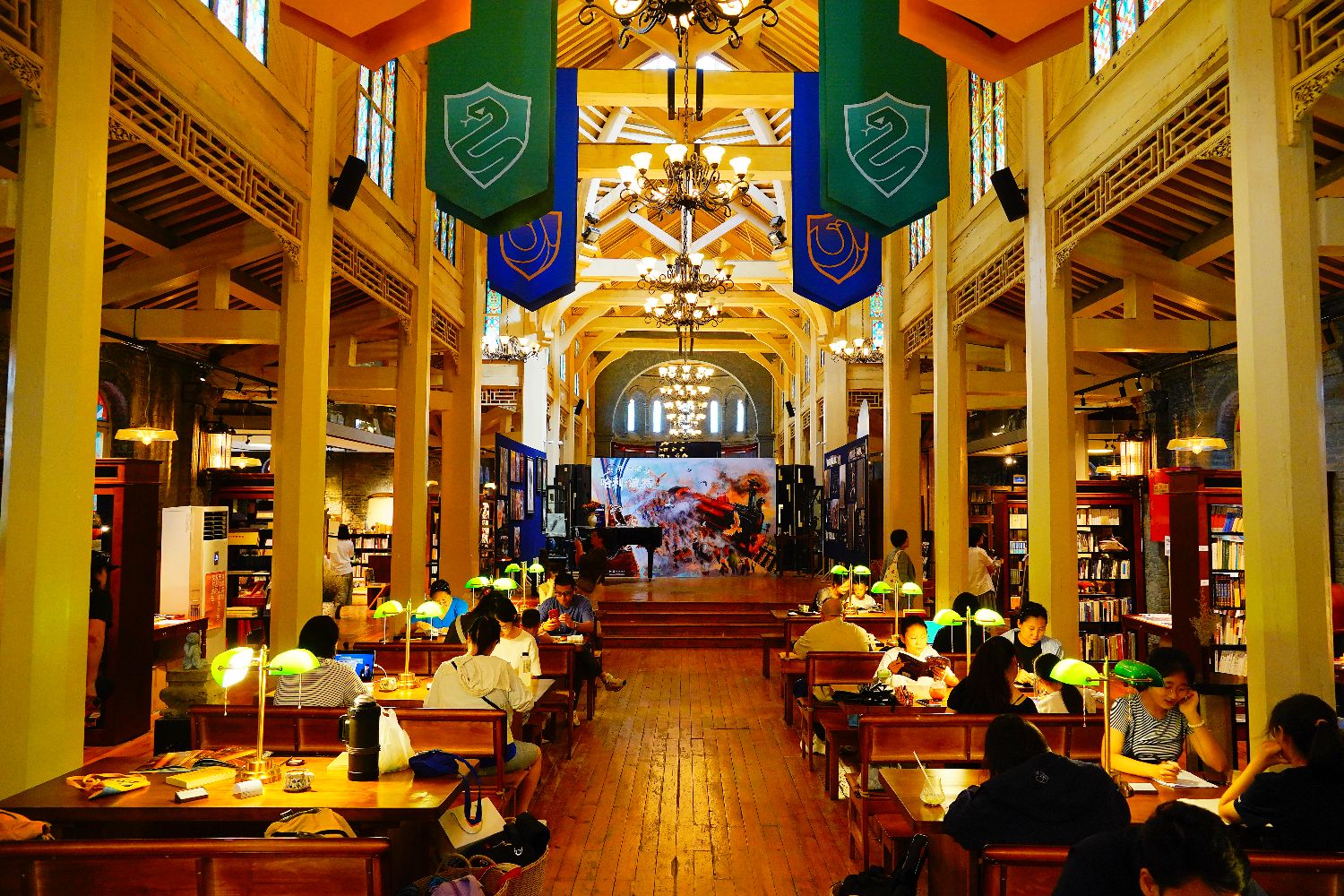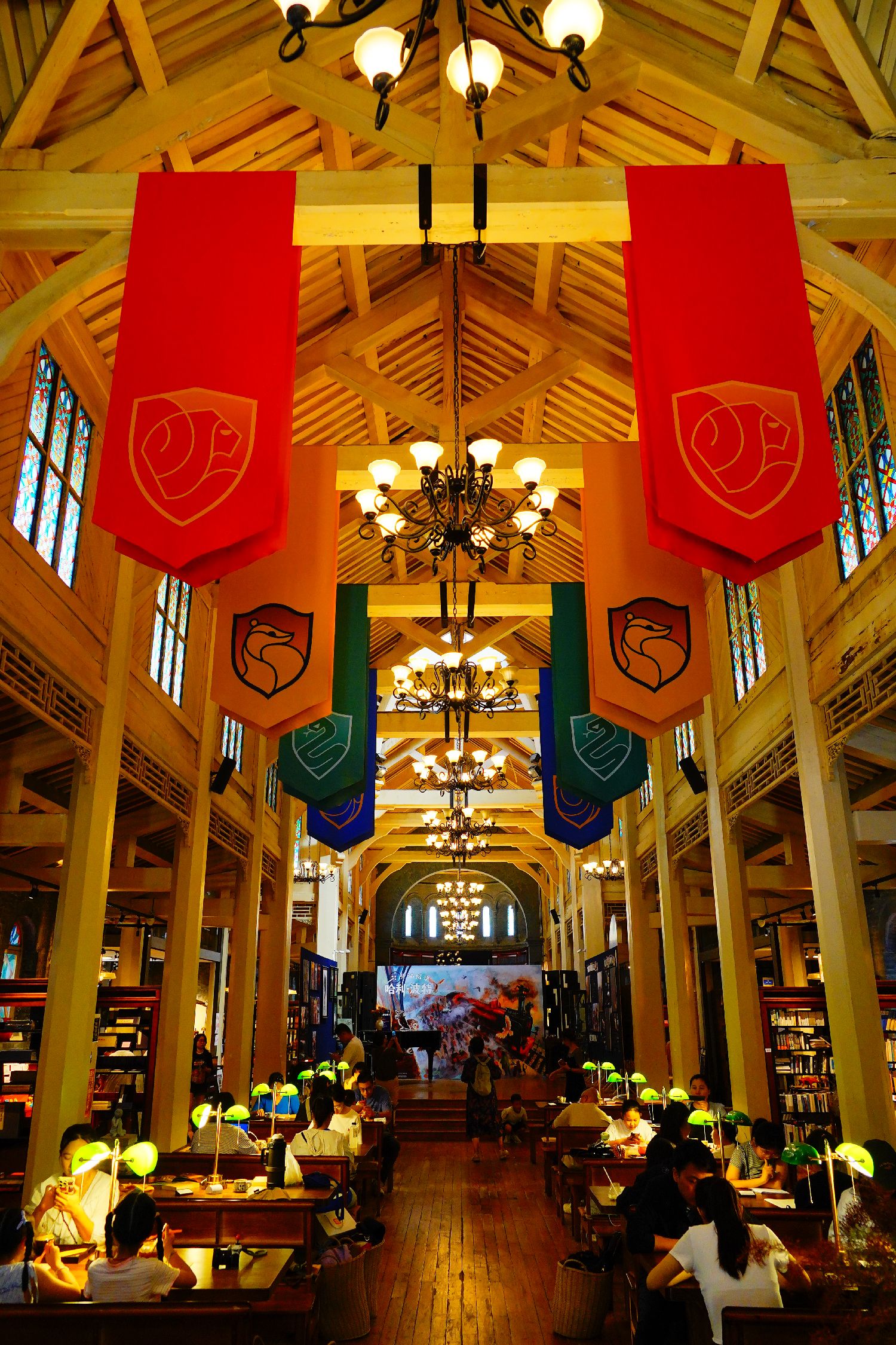 “开始阅读哈利·波特”魔法读书会暨线下阅读空间上挂满了《哈利·波特》内各个魔法学院的代表旗帜。(CFP)
