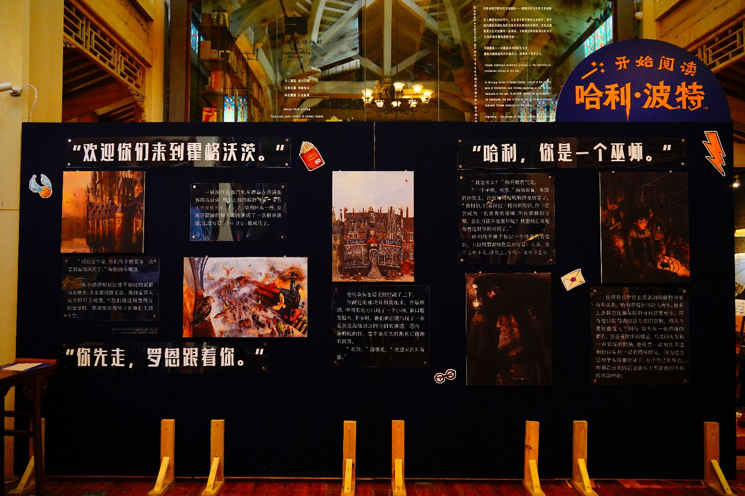 此次举办的《哈利·波特》阅读空间由内文赏析、版本陈列、插画展示、咒语一览等4个板块构成。内文赏析选取了《哈利·波特与魔法石》中的精彩片段引导读者阅读;版本陈列包含在售各版本和绝版版本供欣赏与购买;插画展示选取了小说中的主人公肖像与经典场景,将读者带入小说情境之中;咒语一览则选取了小说中的经典咒语和金句,让读者直观感受小说的魔法气质。此外,空间还设置了魔法留言墙、四大学院盖章、主视觉合影板和打卡赠送贴纸等互动项目。图为“开始阅读哈利·波特”魔法读书会暨线下阅读空间展板。(CFP)