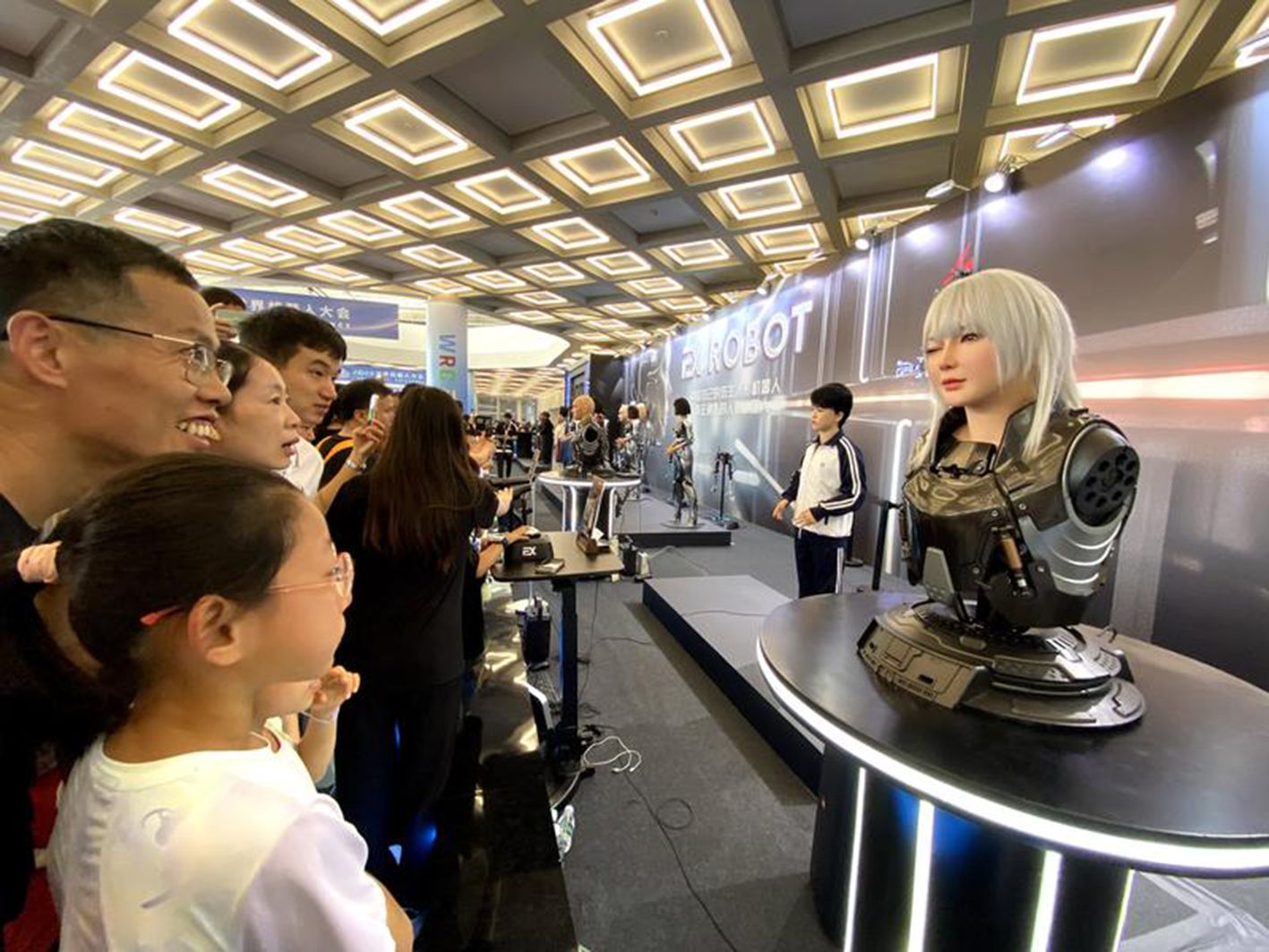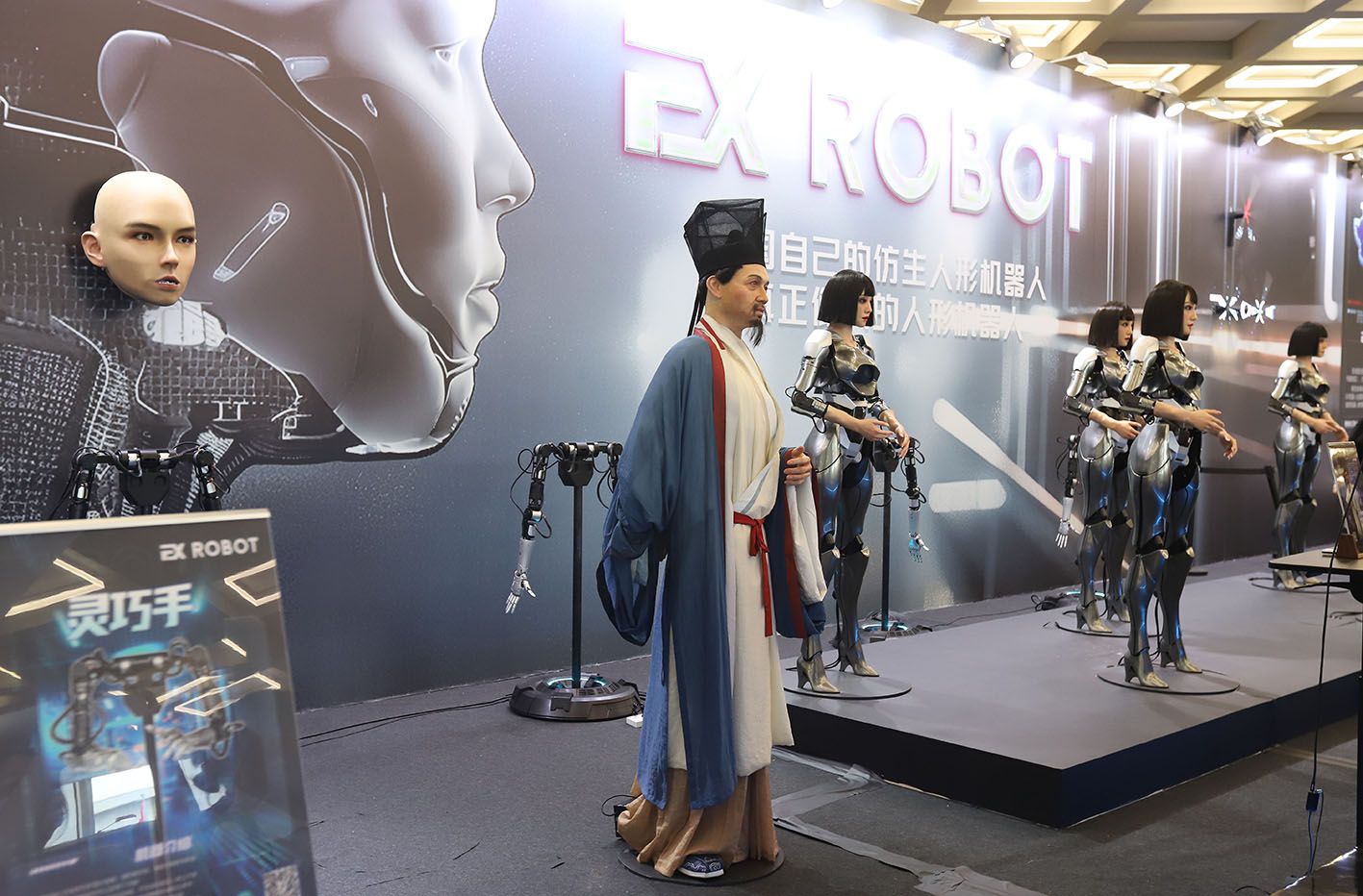 8月25日,在2024世界机器人大会现场EX ROBOT 展出了一款名为“苏轼”的人形仿生机器人,观众可以与其互动对诗。(CFP)