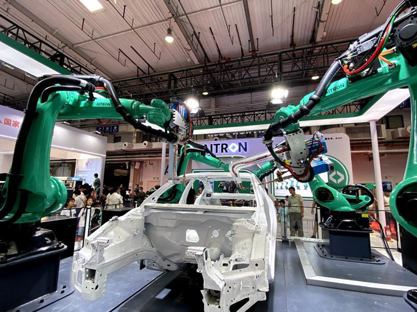 8月24日,在2024世界机器人大会展厅内,六轴机器人伸展钢铁手臂,为观众现场展示汽车自动化焊接技术。(新华社)