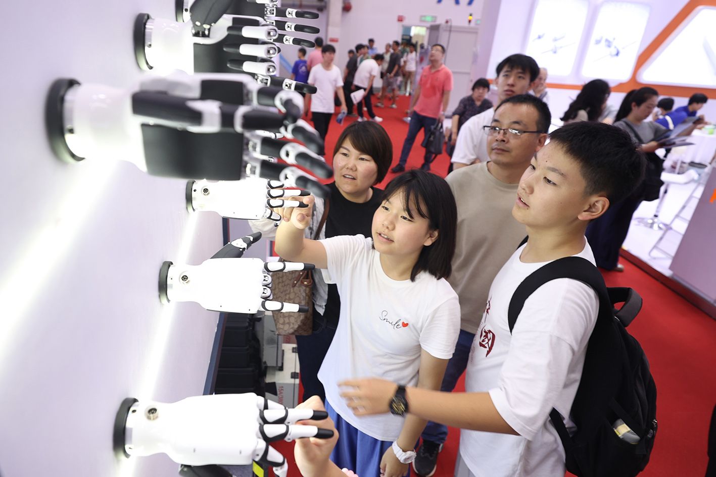 8月25日,参观者在2024世界机器人大会上观看仿人五指灵巧手。(CFP)