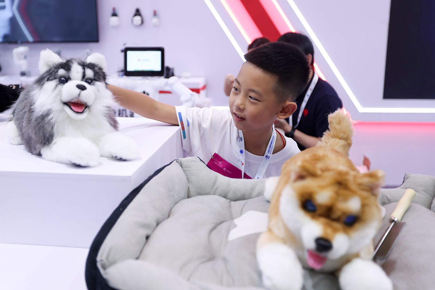 图为2024世界机器人大会现场,儿童观众与仿真宠物机器人互动。(中新社)