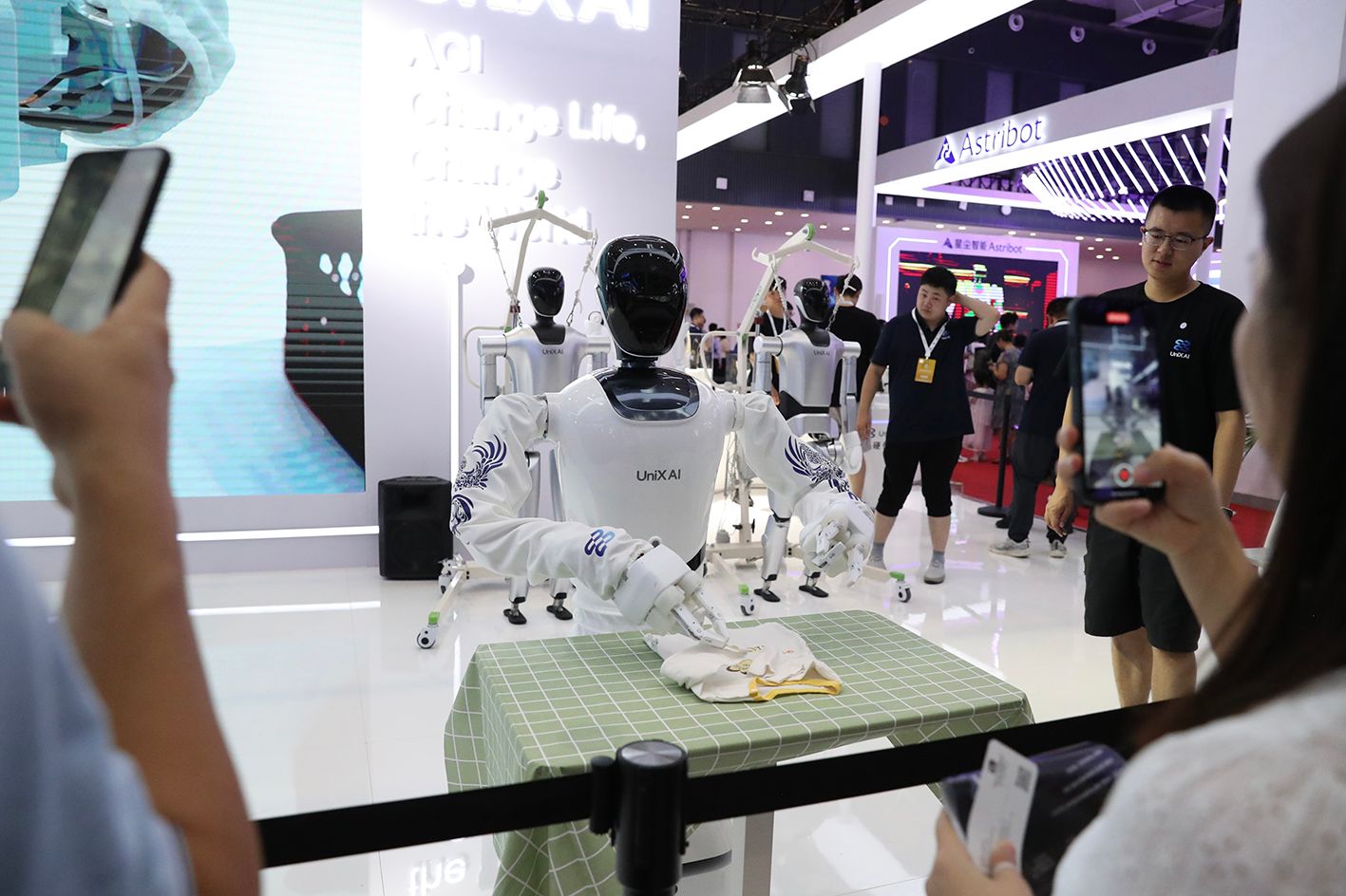 图为2024世界机器人大会现场,观众观看家政机器人叠衣服。(中新社)
