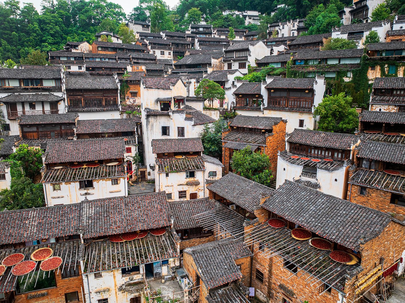 江西省上饶市婺源县篁岭古村,村民们利用晴好天气,将刚收获的辣椒、玉米、南瓜等农作物,晾晒在自家门前屋后的晒架上,白墙黛瓦的古民居披上了五彩斑斓的丰收“锦衣”,呈现出一幅美丽的山村“晒秋图”。(CFP)