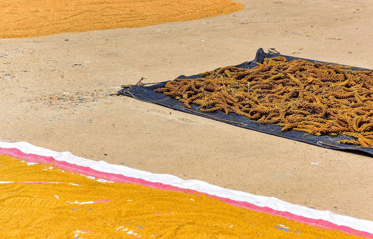 8月24日,山东省日照市莒县龙山镇张家村,丰收的小米谷穗及脱粒的小米在晒秋,金灿灿的小米闪耀着丰收的喜悦,呈现出独特的诗意和美好。(CFP)