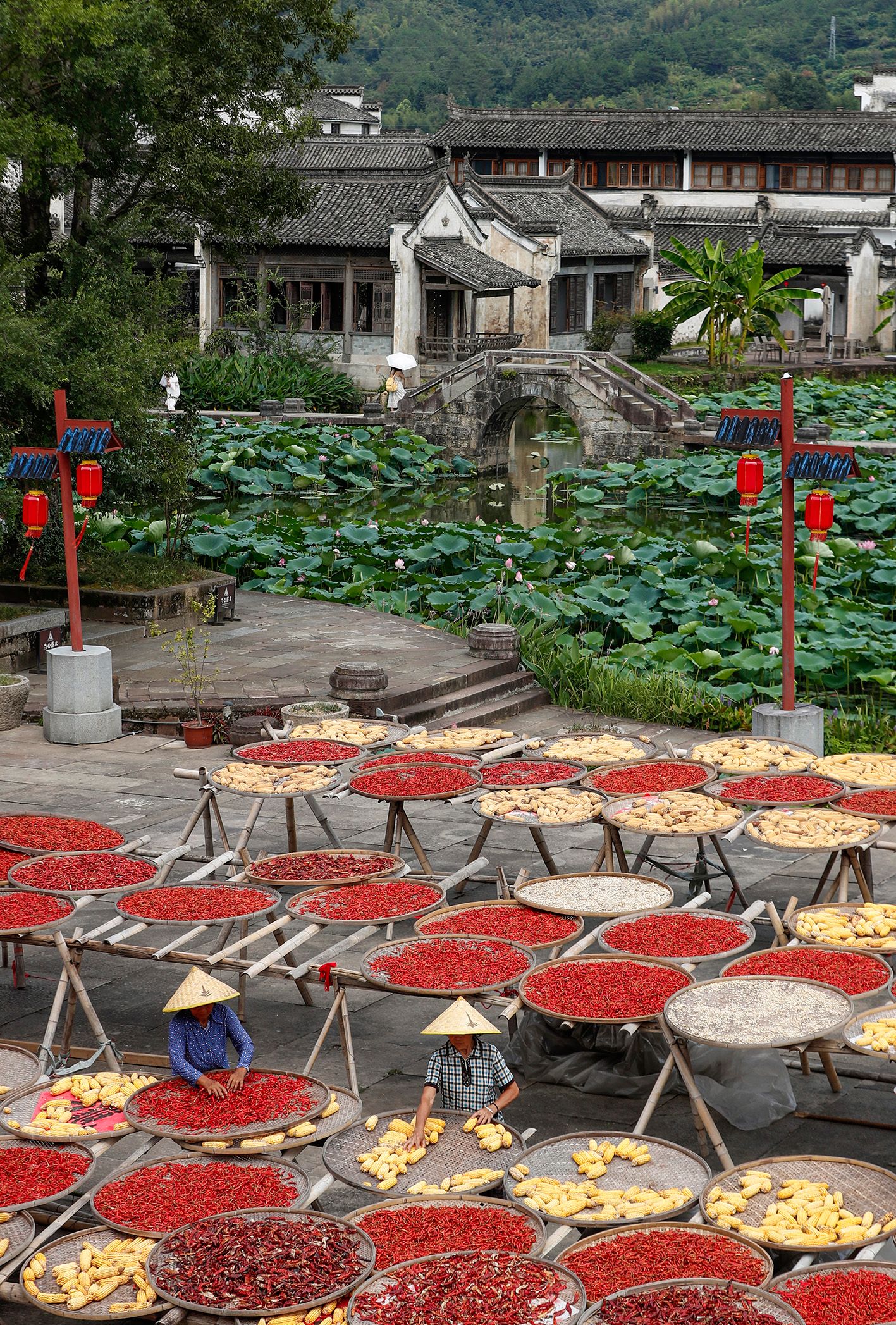 安徽省黄山市徽州区呈坎古村自古都有晒秋习俗,村民趁着晴好天气将收获归仓的玉米、南瓜、红辣椒等农作物进行晾晒,吸引不少游客前往观赏。(无人机照片)(中新社)