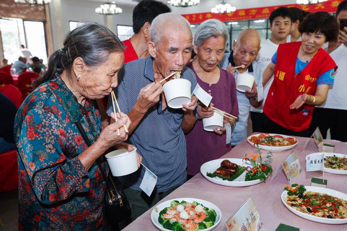 近日,中国各地积极探索多种养老模式,通过整合全区资源,构建多元化养老服务体系,为老年人提供医疗康养、上门照料、文化娱乐等服务,提升老年人生活品质和幸福感。图为8月29日,乾潭镇幸福村的老人们在品尝“幸福方桌”厨艺大赛的参赛厨师们烹饪的特色菜。当日,2024年浙江省建德市“幸福方桌”厨艺大赛拉开帷幕,为建德老年人打造更高品质的“舌尖养老”。(新华社)